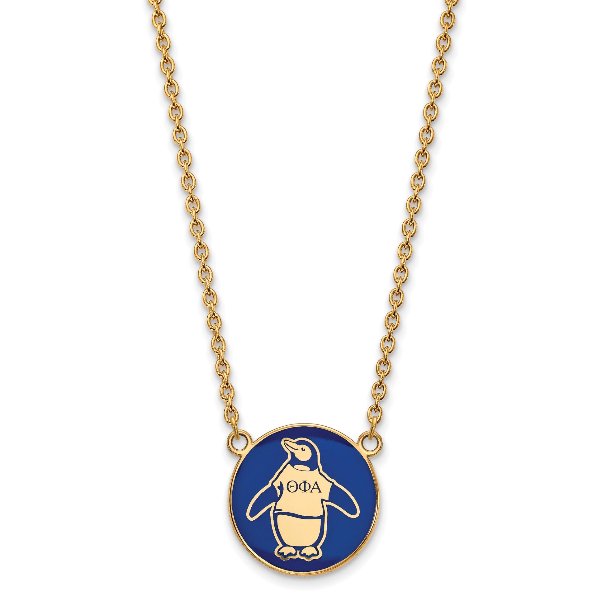 The Gold-Plated Logoart Theta Phi Alpha Sorority Pendant and Necklace set is a stunning way to show your pride. The 18-inch cable chain features a bold 19 mm enamel charm, beautifully crafted in sterling silver with a polished finish. This large piece displays the Theta Phi Alpha logo in vibrant blue and gold tones, making it eye-catching. The laser-cut design adds sharp detail, while the lobster clasp guarantees a secure fit. Whether you wear it daily or on special occasions, the intricate design and quality make this jewelry a perfect choice for any Theta Phi Alpha sister.