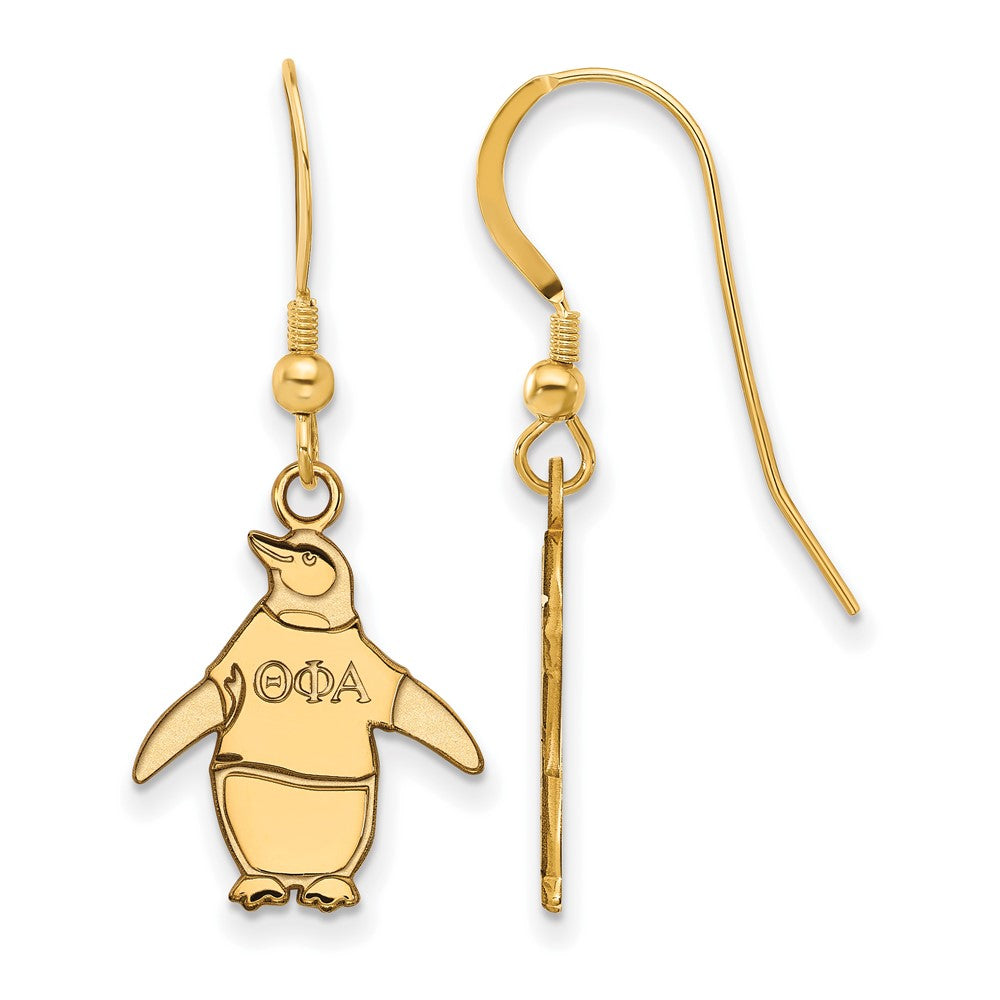 The Silver and Gold-Plated Logoart Theta Phi Alpha Sorority Small Dangle Wire Earrings are a perfect touch of style and spirit. Made from high-quality sterling silver, they are polished for a sleek shine. The earrings feature a 36mm length with a charming 17mm logo charm that proudly displays the Theta Phi Alpha symbol. Gold plating adds a bright, timeless look. They hang from a French wire closure for easy wear and stay secure all day. These earrings are light and small, ideal for everyday or special occasions, helping you show your sorority pride effortlessly.