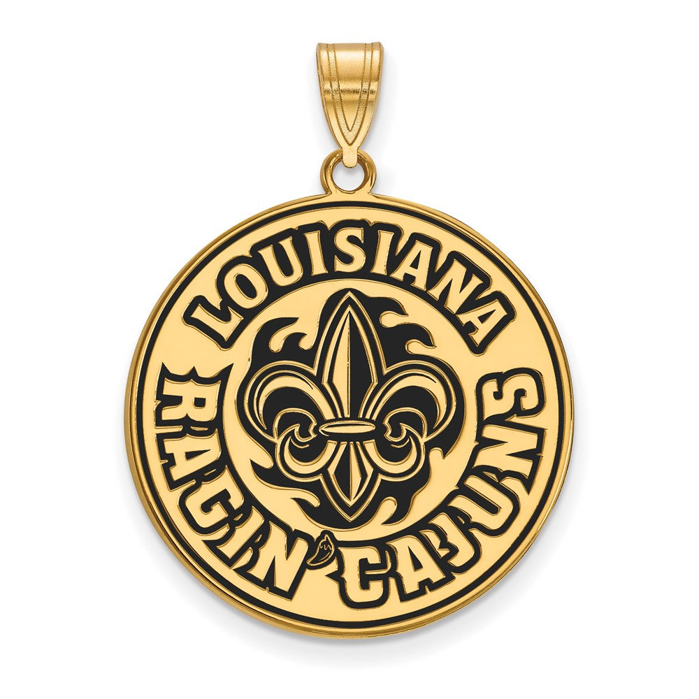 Show off your school pride with the Logoart University of Louisiana at Lafayette extra large pendant. Crafted from polished 925 sterling silver and coated in gold plating, this bold piece measures 32 mm long and 25 mm wide, making it a true statement accessory. The pendant features a vibrant enameled logo that adds a splash of color. Laser-cut details ensure sharp lines and durability. With a 6 mm bail, it easily hangs on your favorite chain. Perfect for LSU fans, the Logoart University of Louisiana at Lafayette pendant combines quality with style to keep your school spirit shining.