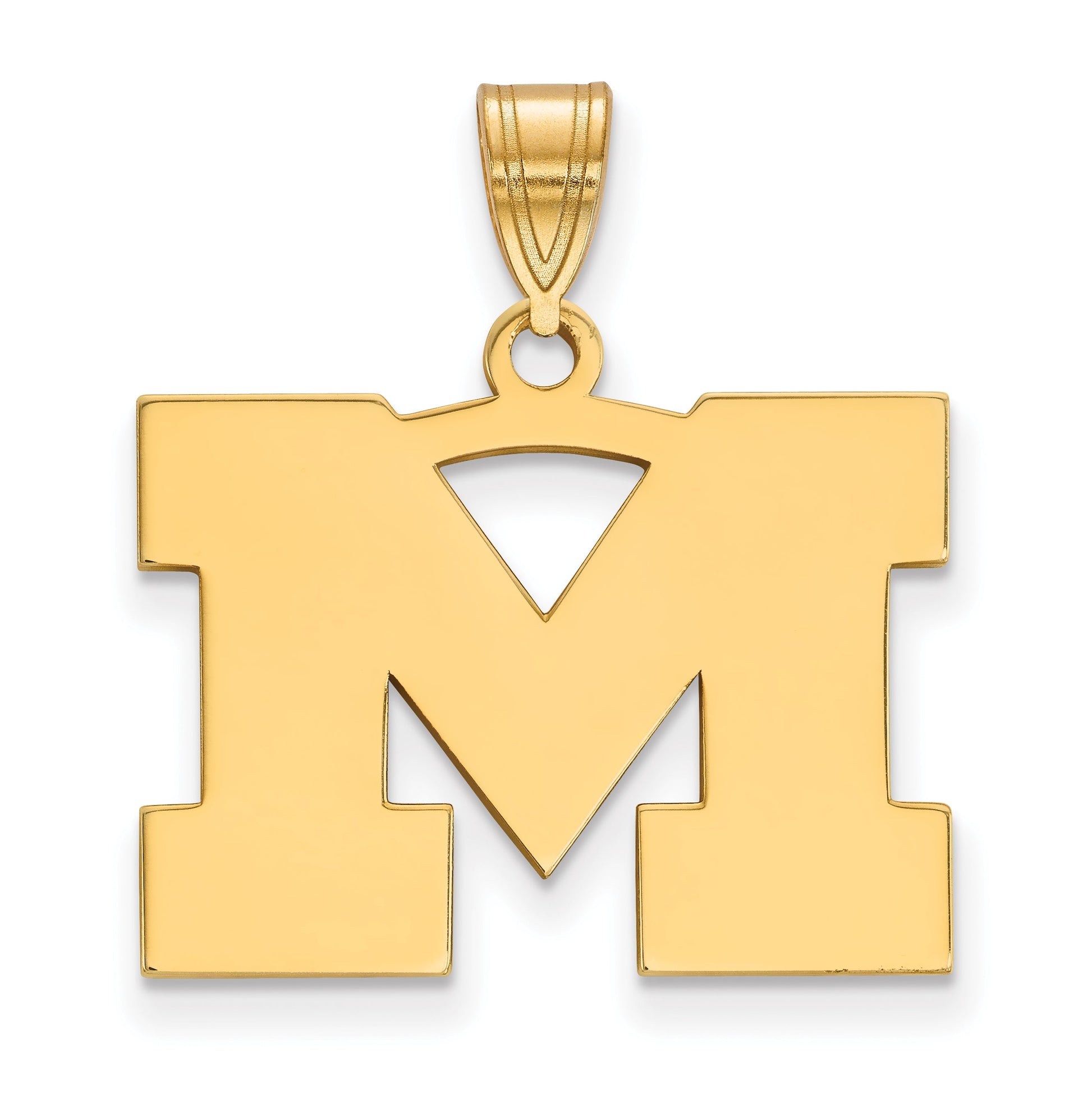 Show your team spirit with the LogoArt University of Michigan Letter M Pendant. Crafted from shiny sterling silver, this pendant is coated in a rich gold tone for a bold look. Measuring 23 mm long and 22 mm wide, it features the iconic Michigan "M" in a laser-cut design that’s clean and sharp. The medium size makes it perfect for everyday wear, while the polished finish adds a touch of class. Licensed by NCAA and made by LogoArt LLC, the University of Michigan Letter M Gold-Plated Sterling Silver Pendant is a stylish way to show your pride and support.