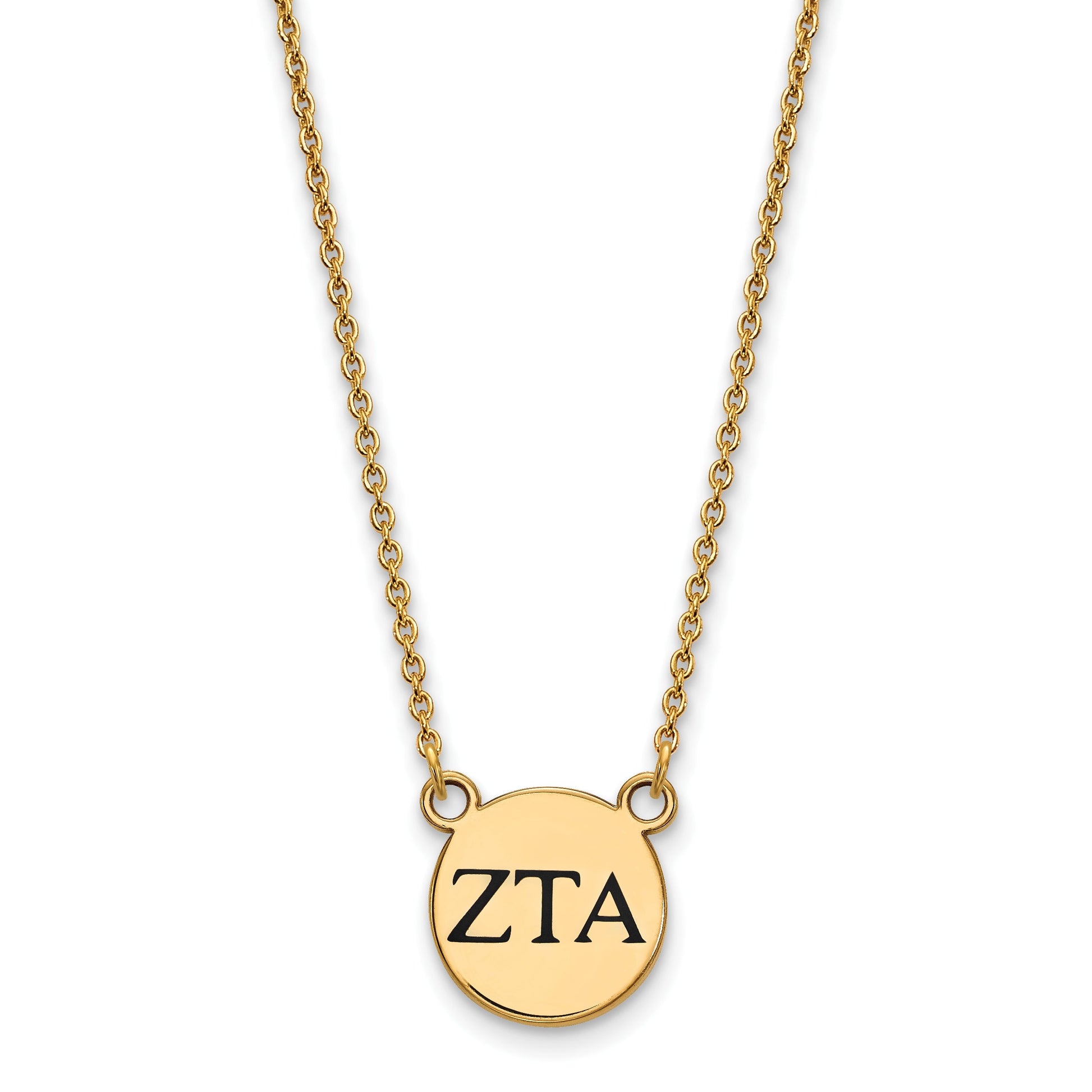 The LogoArt Zeta Tau Alpha Greek Letters Necklace is perfect for every proud sister. Crafted from high-quality sterling silver with a shiny gold-plated finish, this piece features a small black enamel charm that displays the sorority’s name clearly. The necklace measures 18 inches long and has a sturdy lobster clasp for easy wear. Its sleek design makes it ideal for daily use or special events. Known for durability and style, the Zeta Tau Alpha Necklace adds a touch of class to any outfit, showcasing your pride in a subtle way.