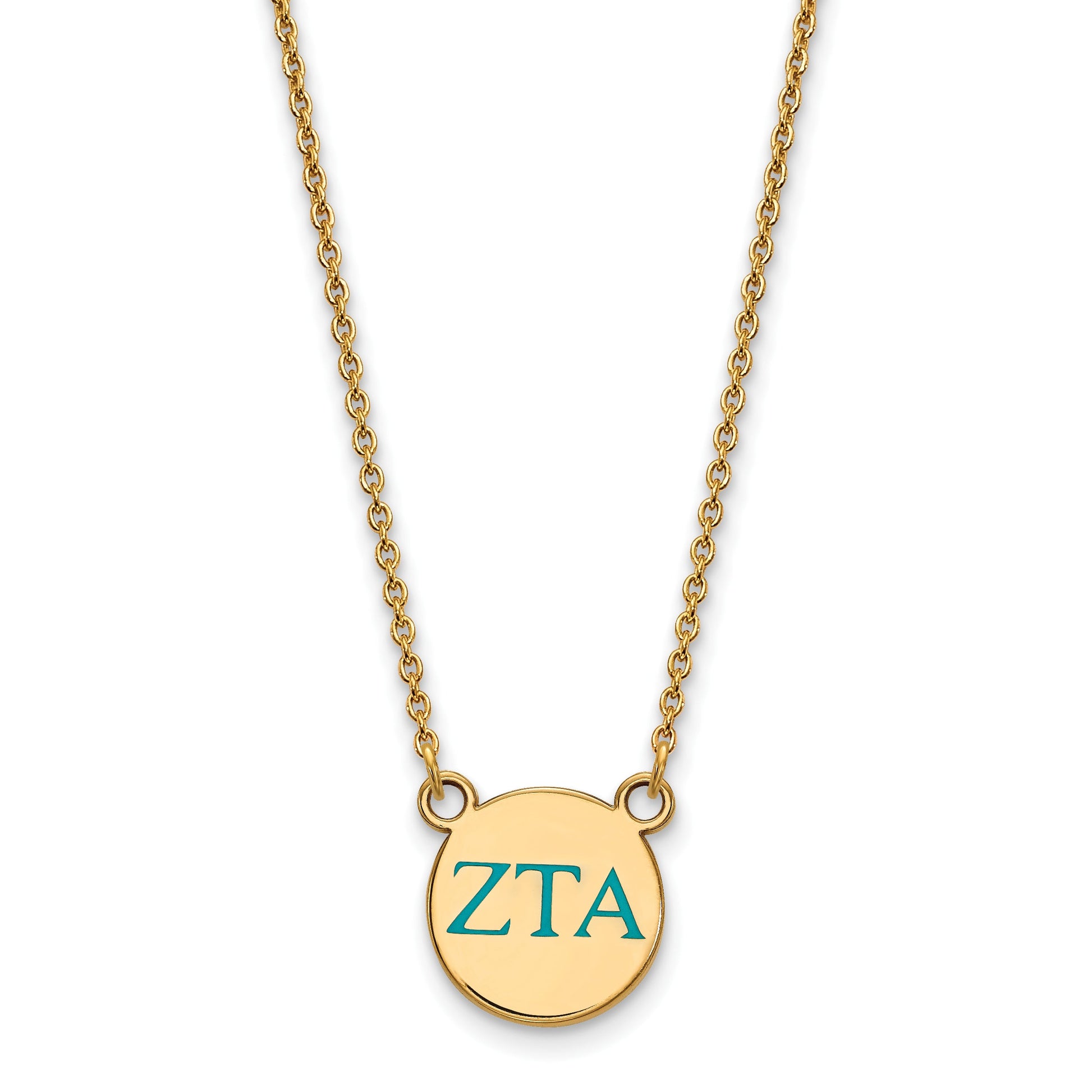 Introducing the LogoArt Zeta Tau Alpha Greek Letters Necklace, a sleek piece that shows your sisterhood pride. Made from polished sterling silver, it is plated in bright gold and features a vivid blue enamel accent. The charm measures 12 mm, and the 18-inch cable chain offers a comfortable fit. Crafted with laser-cut precision, this necklace is sturdy and stylish, perfect to wear daily or on special occasions. The lobster clasp keeps it secure while the small size adds a delicate touch. Show your loyalty with the LogoArt Zeta Tau Alpha necklace, a fine jewelry piece that blends beauty with meaning.