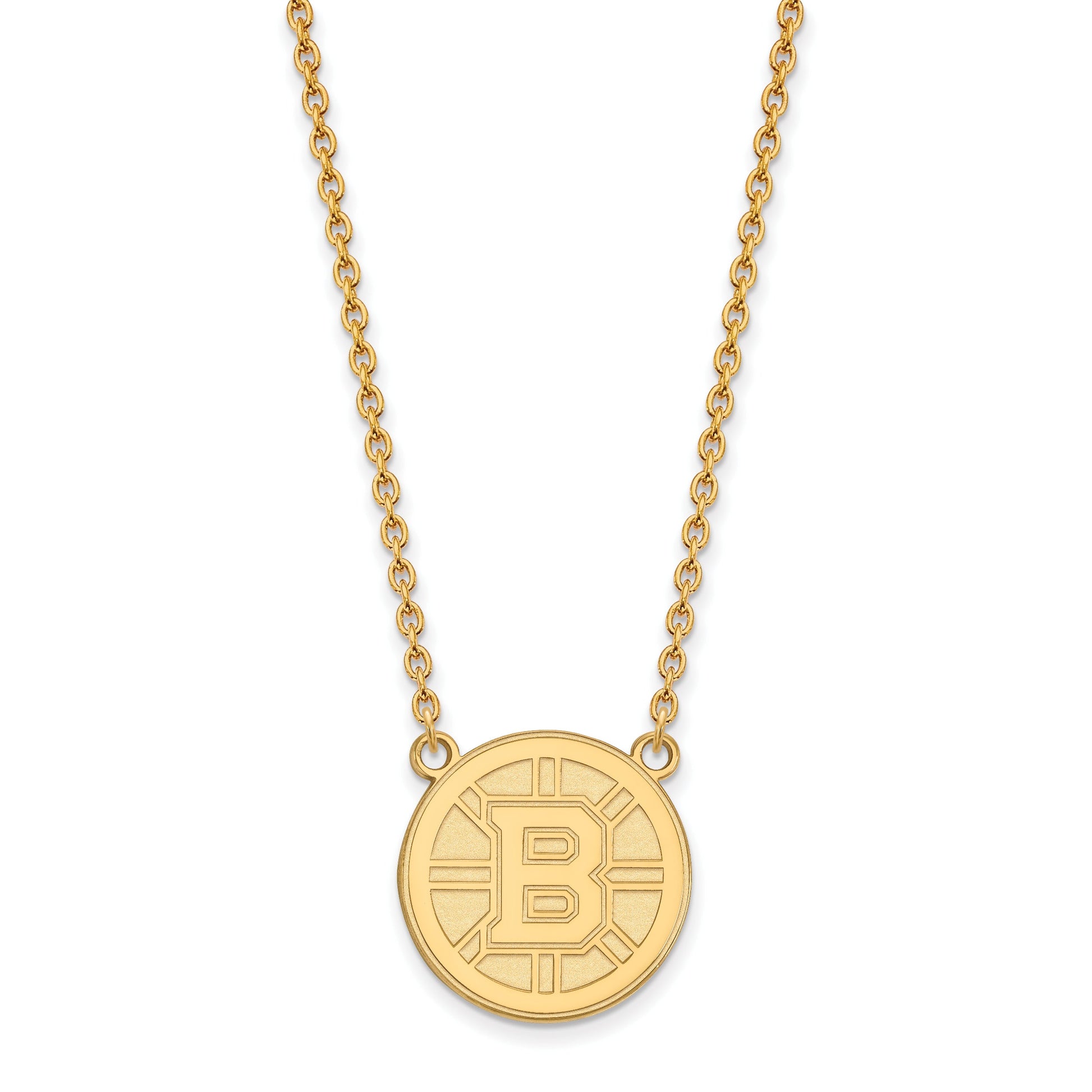 Show your team spirit with the NHL Logoart Boston Bruins Large Pendant Necklace. Crafted from high-quality 925 sterling silver, this piece is gold-plated for added shine. The 18-inch chain makes it perfect for everyday wear, while the large pendant, measuring 18 mm, boldly displays the iconic Bruins logo. Designed with laser-cut precision, the pendant captures every detail of the team's emblem. This unisex necklace is an ideal accessory for hockey fans who want to sport their pride. The Boston Bruins Large Pendant Necklace combines durability and style, making it a must-have jewelry piece for any fan of the team.
