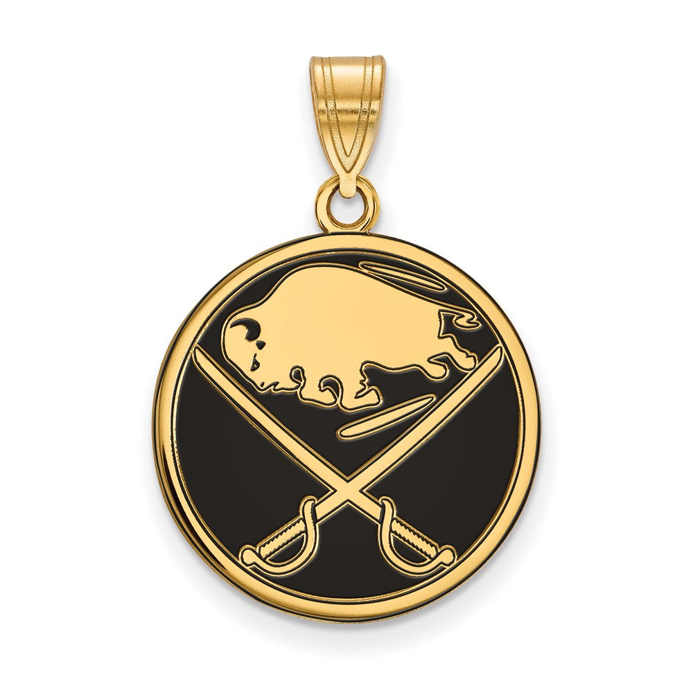 Show off your team spirit with the NHL LogoArt Buffalo Sabres large enameled pendant. Crafted from high-quality sterling silver and finished with a gold-plated shine, this bold piece measures 25 mm long and features the iconic Sabres logo in vibrant enamel. Its large size makes a true statement, perfect for fans who want to wear their pride loud and clear. The pendant comes with a sturdy 6 mm bail, making it easy to add to any chain. Whether you’re at the game or out and about, the Buffalo Sabres large enameled pendant is a must-have for true supporters.
