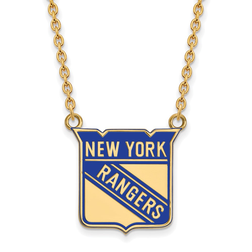 Show off your team spirit with the NHL Logoart New York Rangers Large Enameled Pendant Necklace. Crafted from genuine sterling silver and finished with a bright gold plating, this 18-inch necklace pairs well with any look. The bold pendant features the classic Rangers logo, measuring 21 mm by 19 mm, and is lightweight for daily wear. Designed for both men and women, this jewelry piece is perfect for showing your support. The New York Rangers necklace is licensed by the NHL and LogoArt LLC, making it a true fan's must-have. Rock your team pride with this eye-catching piece.