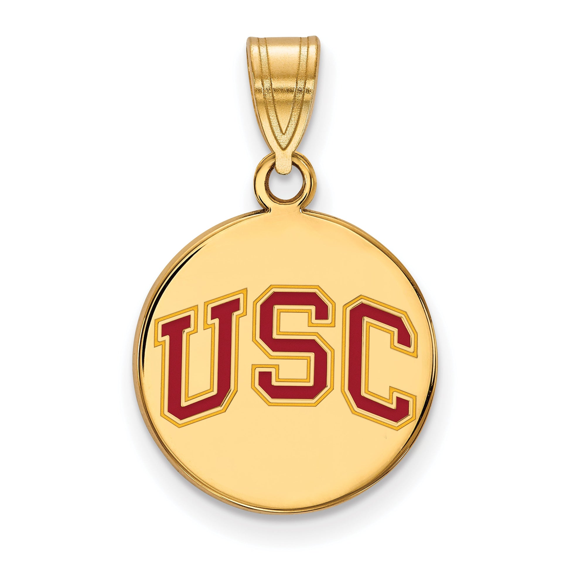 Show your school pride with the Sterling Silver Gold-Plated University of Southern California U-S-C Medium Enameled Disc Pendant. Crafted from high-quality sterling silver and coated in a bright gold finish, this pendant measures 22 mm long and 15 mm wide. It features a vibrant, enameled USC logo that lasts well over time. The pendant hangs on a sturdy bail and can be added to your favorite chain or used as a keychain. Made with precision, this piece truly shows off your colors and spirit. Wear the Sterling Silver Gold-Plated USC Pendant with pride wherever you go.
