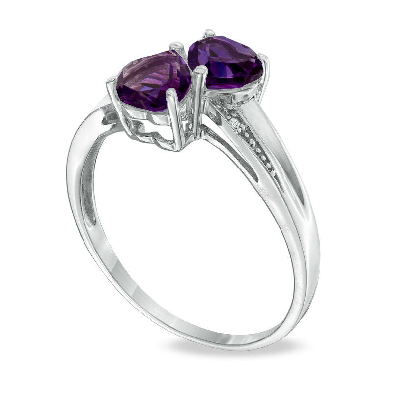 Pamper your loved one who celebrates their birthday in February with this exquisite Heart-Shaped Amethyst and Diamond Accent Double Heart Ring in Sterling Silver. Its unique double heart design crafted in sterling silver adds a touch of elegance to any outfit. Adorned with two 5.0mm heart-shaped purple amethysts, the birthstone of February, it radiates a vivid, colorful appeal. The sparkling ribbons of diamond accents and delicate beaded detailing on either side of the shank impart a dose of glittering charm. This ring delivers a stunning, polished sheen and is adjustable to fit your loved one's desired size. Please note that rings made of sterling silver cannot be modified post-purchase.