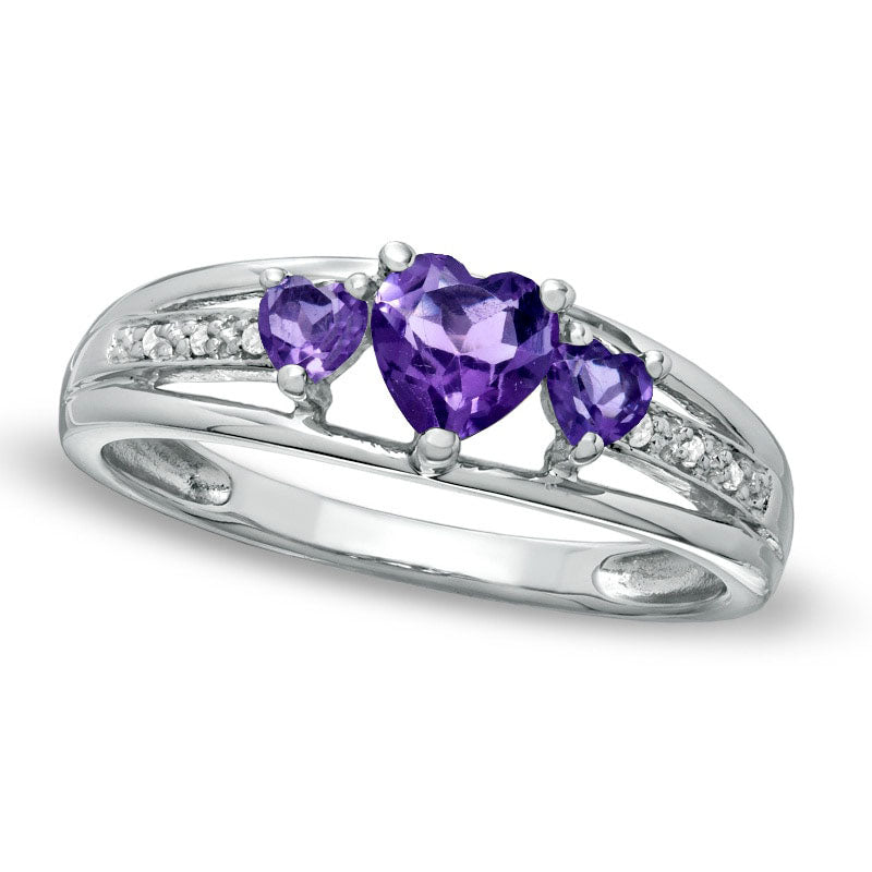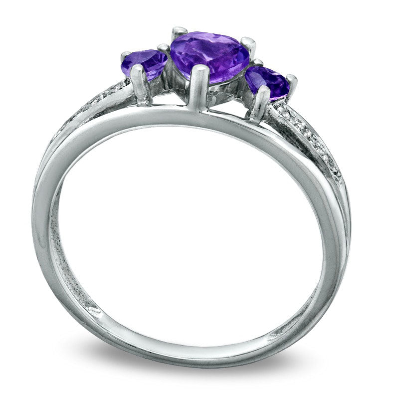 Celebrate your loved one's February birthday with a beautiful Heart-Shaped Amethyst and Diamond Accent Three Stone Promise Ring in 10K White Gold. This stunning piece features three impressive heart-shaped amethysts that rest gracefully atop a triple split shank, expertly crafted in 10K white gold. Delicate diamond accents add extra sparkle to the shank, giving the ring an ethereal look. With a brilliant shine, this ring will become her go-to accessory. It's custom-made to fit her ring size, and while sterling silver rings cannot be resized after purchase, this elegantly crafted ring will last a lifetime. Show your love for your partner with this exquisite Heart-Shaped Amethyst and Diamond Accent Three Stone Promise Ring.