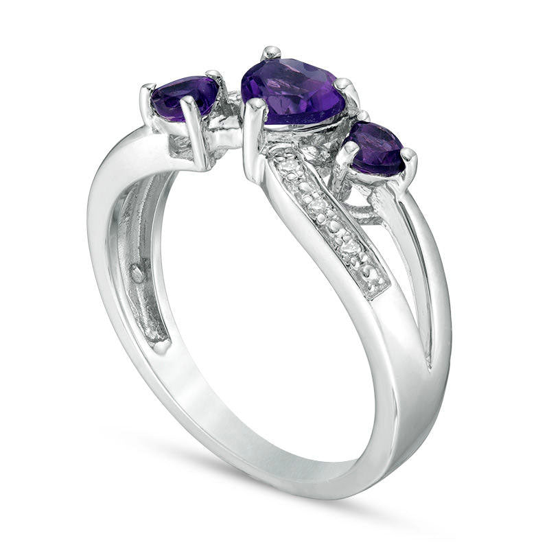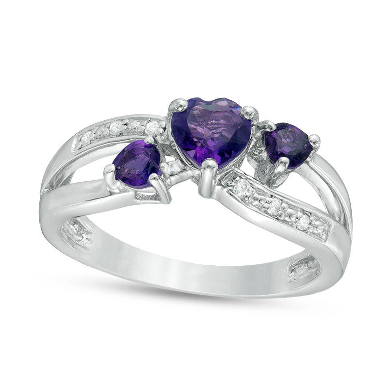 The Heart-Shaped Amethyst and Diamond Accent Three Stone Ring in Sterling Silver is a beautiful piece of jewelry that would make a great addition to any woman's collection. The ring features three heart-shaped bright purple amethyst stones, with the largest being a 5.0mm center stone, arranged along the center of the ring's split shank. The design is completed with sparkling diamond accents that add even more dazzle to the ring's feminine charm. This stunning piece can be worn with casual or dressy attire and is a custom-made fit for the wearer's ring size. Please note that sterling silver rings cannot be resized after purchase.