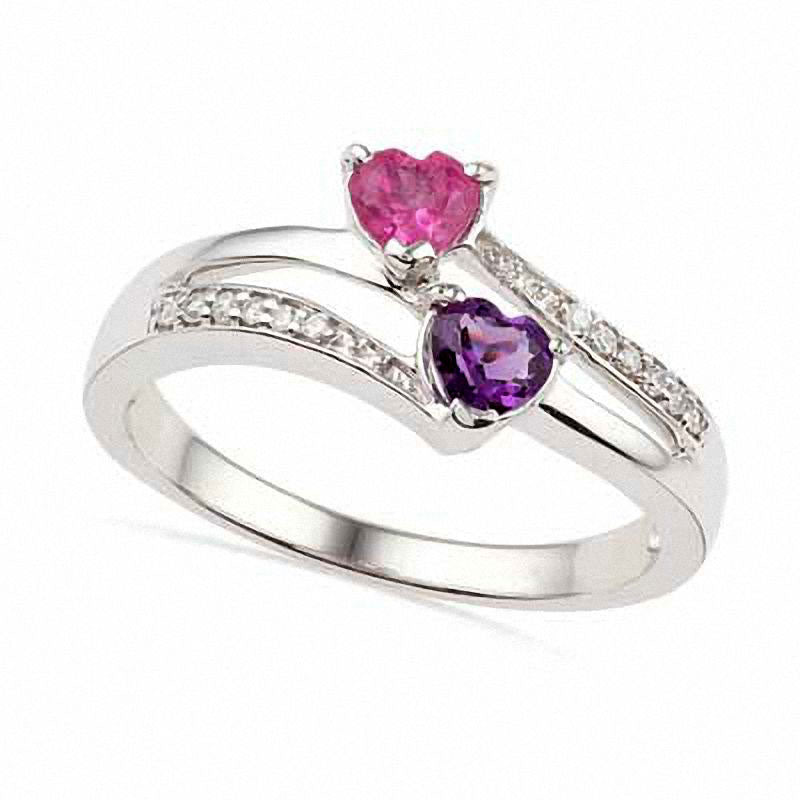 Fall in love with the captivating beauty of this Heart-Shaped Amethyst, Lab-Created Pink Sapphire, and Diamond Accent Ring in Sterling Silver. The ring boasts a pair of lovingly crafted heart-shaped gemstones - a radiant lab-created pink sapphire and a gorgeous lavender amethyst - set side by side atop a double shank adorned with shimmering diamonds. This spectacular ring sparkles with sophistication and style, making it a perfect symbol of a vibrant romance. Plus, this stunning ring is custom made to fit her finger, but please note that sterling silver rings cannot be resized after purchase.