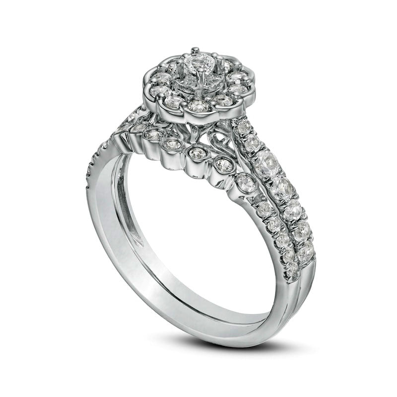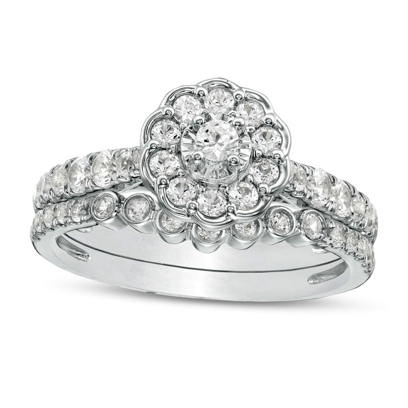 Lab-Created White Sapphire Frame Flower Bridal Engagement Ring Set in Sterling Silver