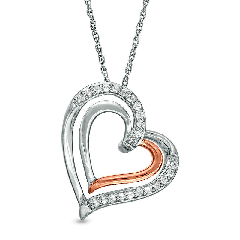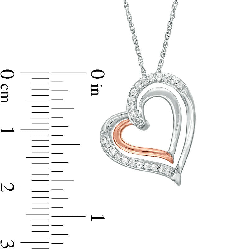Lab-Created White Sapphire Tilted Double Heart Pendant in Sterling Silver and 10K Rose Gold