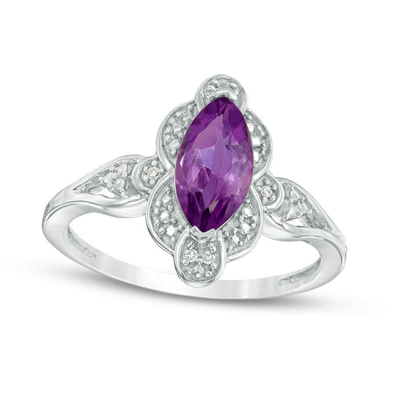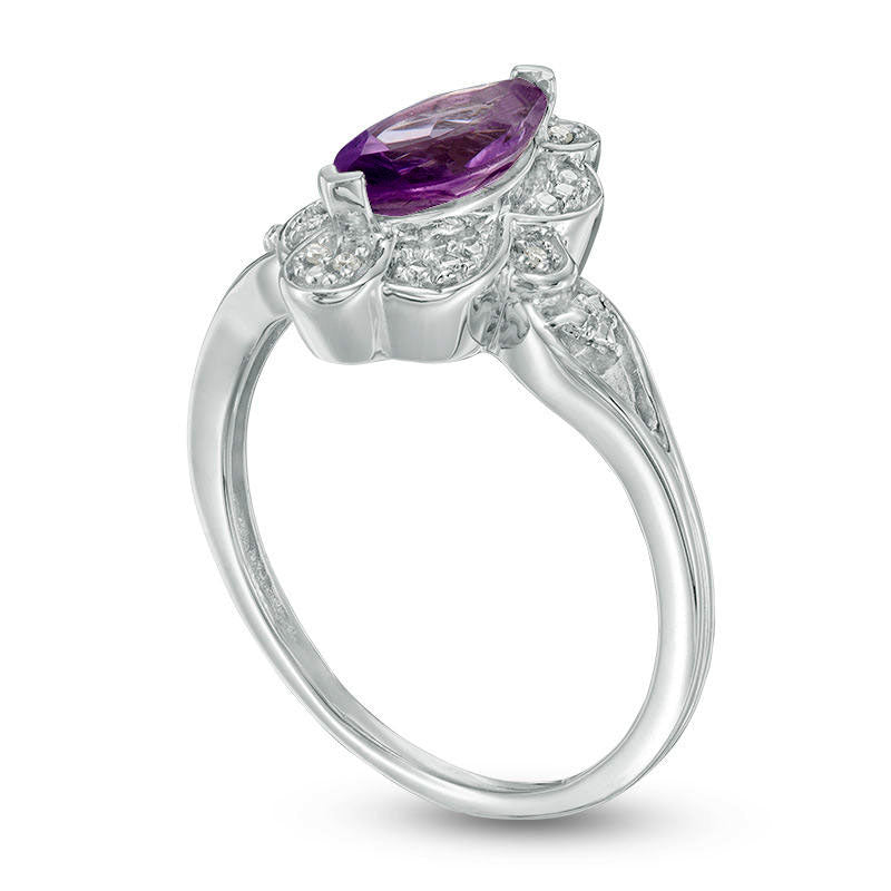 Unleash the sweetest expression of elegance with this enchanting gemstone ring. Made from high-quality sterling silver, this stunning piece showcases a magnificent 10.0 x 5.0mm marquise-cut amethyst in a vibrant purple hue. The center stone is beautifully encased within a sculpted scallop-edged frame that is adorned with a plethora of dazzling pavé-set diamond accents. The shank on either side features an intricately designed open teardrop shape, complete with a polished beaded finish. This radiant ring is polished to a brilliant shine, perfect for complementing her attire for any special occasion. Specially made to fit her ring size, be sure to secure this must-have addition for her jewelry collection. Please note that sterling silver rings cannot be resized after purchase.