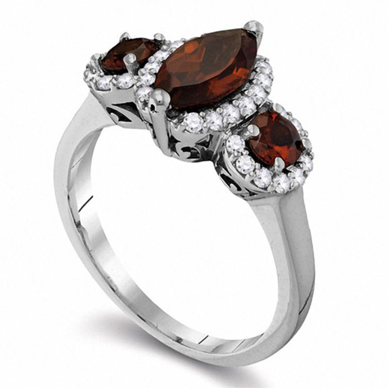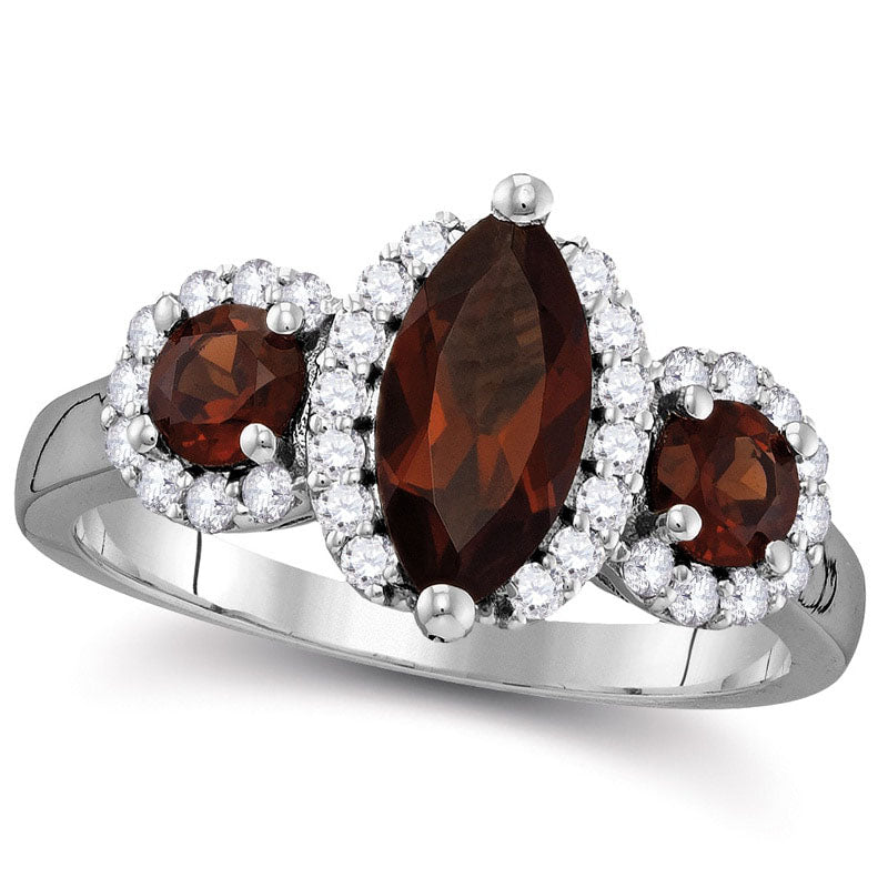 Marquise Garnet and 0.33 CT. T.W. Natural Diamond Frame Three Stone Ring in Solid 14K White Gold