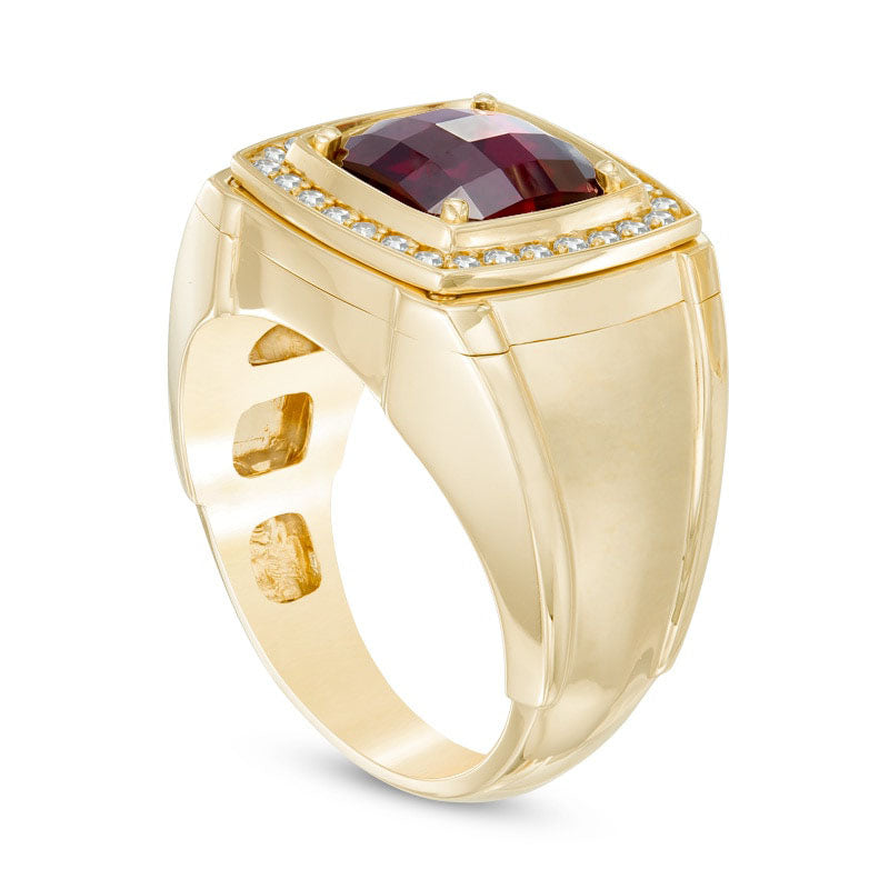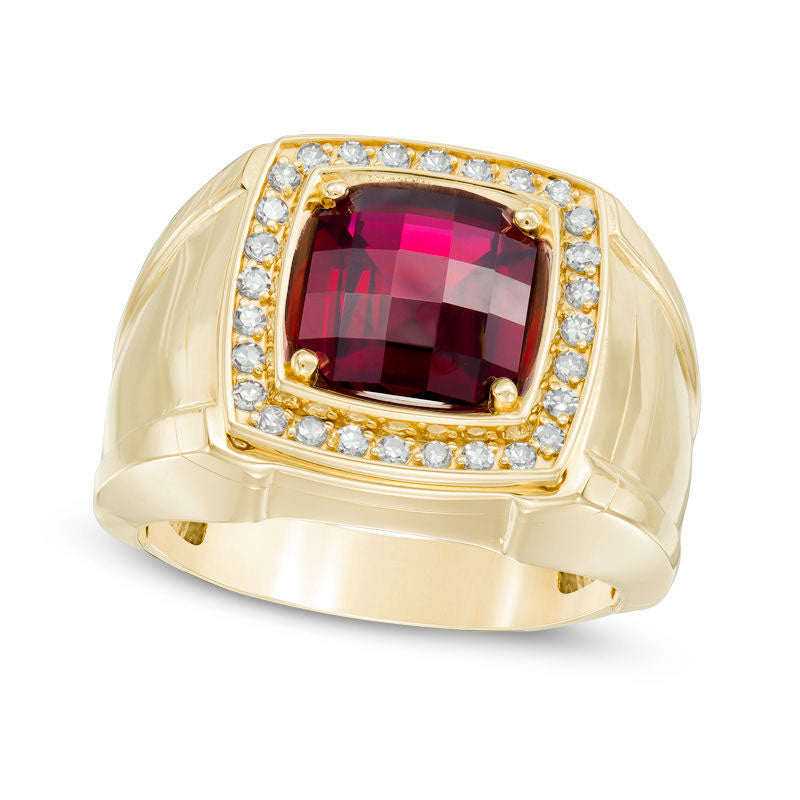 This 10K gold comfort-fit ring for men boasts a powerful and eye-catching design. It features a sizable 9.0mm cushion-shaped, checkerboard-cut lab-created garnet in regal red, accented by a frame of dazzling round diamonds. The ring's stepped edges provide a distinctive detail. With a total diamond weight of 1/4 ct. t.w., this ring exudes radiance and boasts a polished shine. A truly striking piece of jewelry for the confident man.