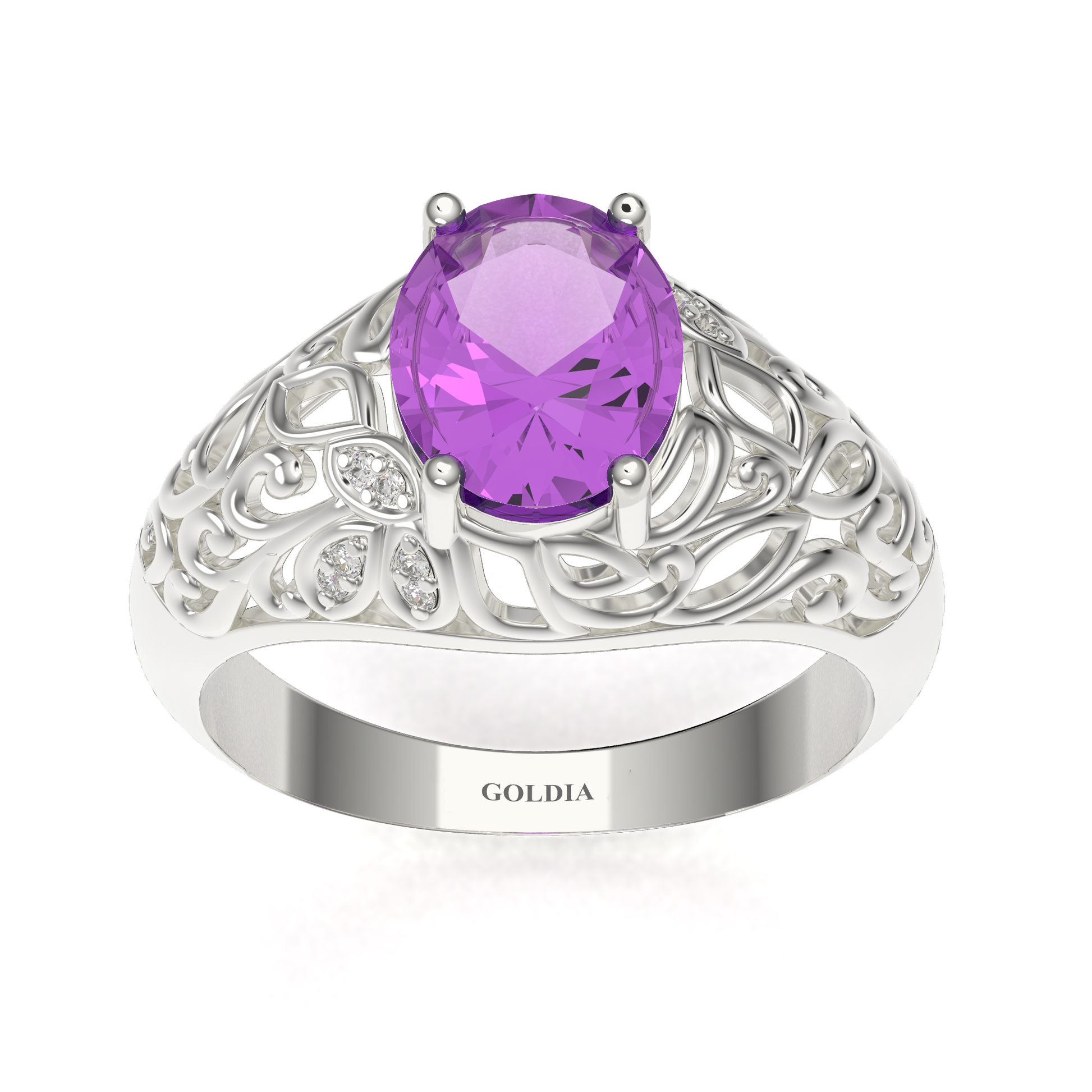 Natural 10x8mm Oval Amethyst & Diamond Ring in Rhodium-plated Sterling Silver