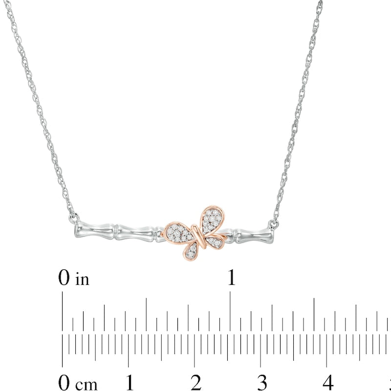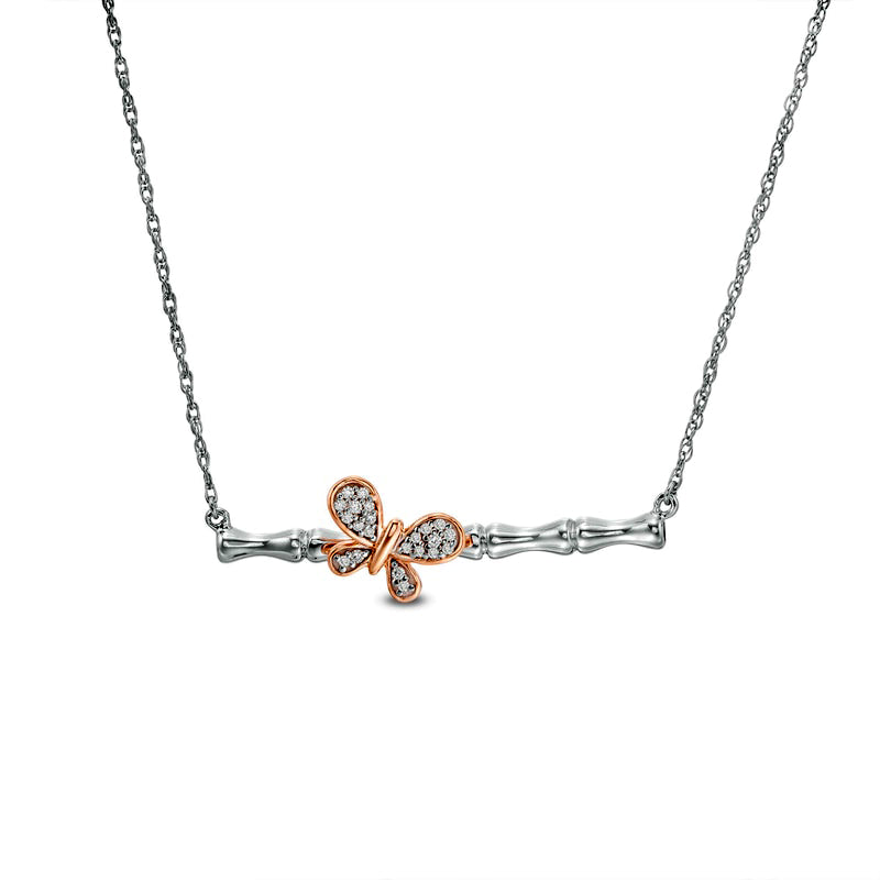 Natural Diamond Accent Sideways Bamboo Stick with Butterfly Necklace in Sterling Silver and 10K Rose Gold