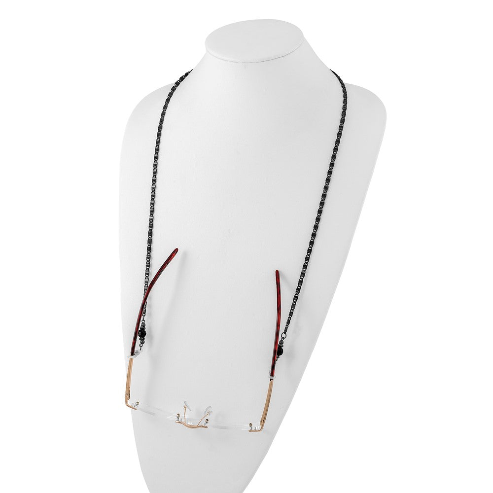 Introducing the Non Metal 1928 Jewelry Black-Plated Black Faceted Crystal Bead Eyewear Holder. This chic eyewear holder features a stunning 30-inch chain adorned with black faceted crystal beads. Crafted with a sleek black-plated finish, it offers a perfect blend of elegance and functionality. Whether you're gifting it to a special someone or treating yourself, this unique piece doubles as a stylish necklace and an essential accessory. Secure your eyewear in style with the Non Metal 1928 Jewelry Black-Plated Black Faceted Crystal Bead Eyewear Holder.