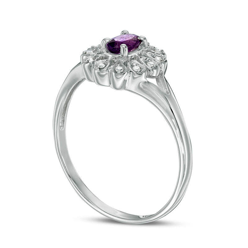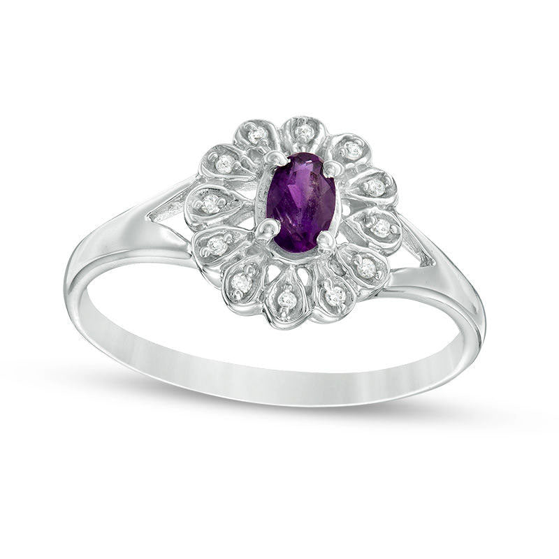 Oval Amethyst and 0.05 CT. T.W. Natural Diamond Flower Frame Ring in Sterling Silver