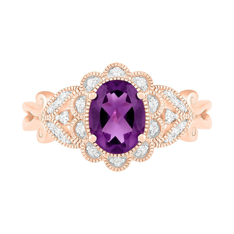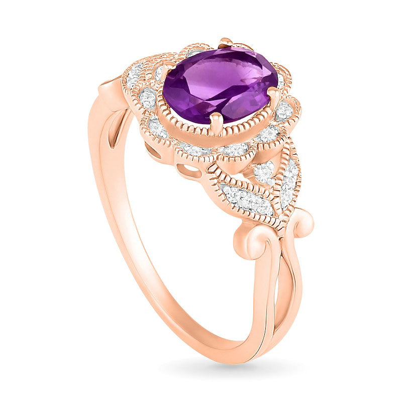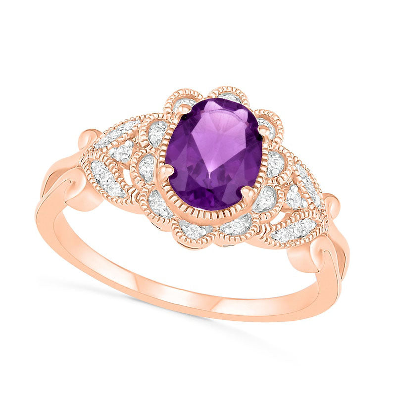 Oval Amethyst and 0.10 CT. T.W. Natural Diamond Scallop Frame Leaf-Sides Antique Vintage-Style Flower Ring in Solid 10K Rose Gold