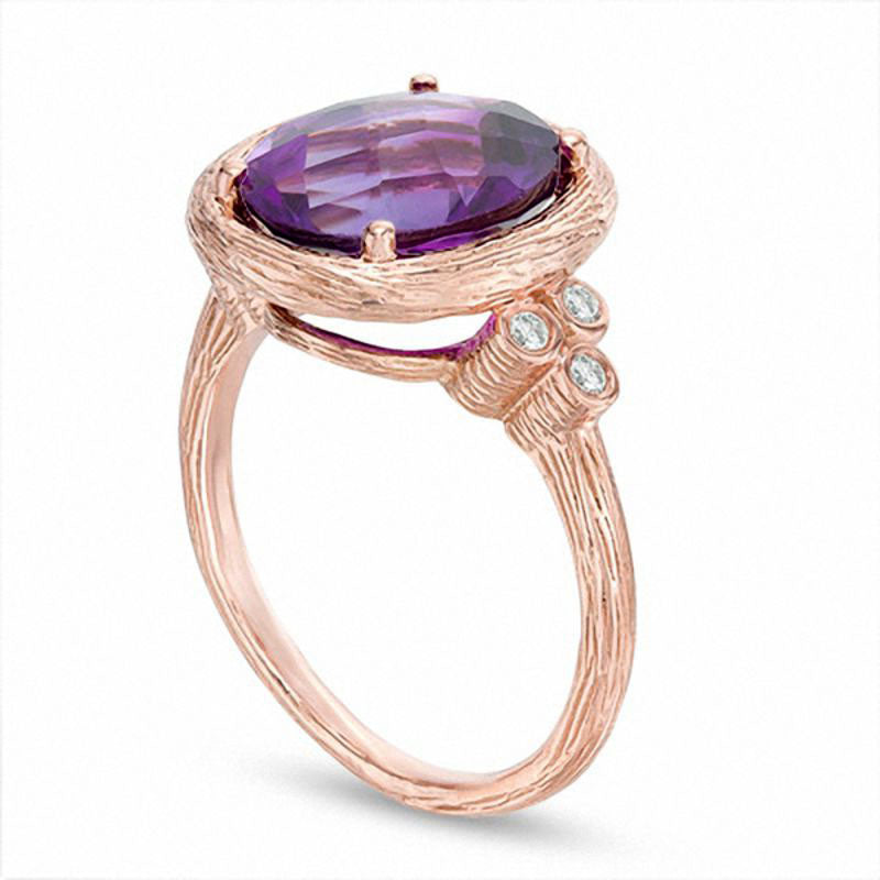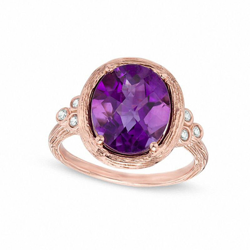 Oval Amethyst and 0.10 CT. T.W. Natural Diamond Tri-Sides Textured Frame Ring in Solid 10K Rose Gold