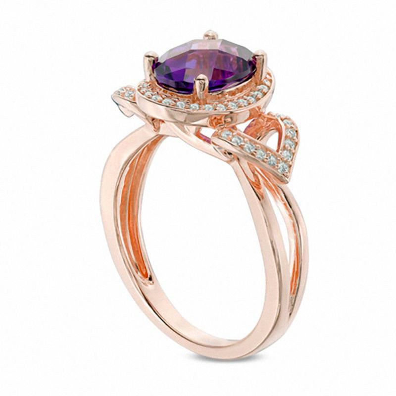 This beautiful ring is both stunning and unique, with a bright purple oval-shaped amethyst at the center. The amethyst is surrounded by diamonds, and the band is made of 10K rose gold. The design also features diamond-lined leaves and a split shank. This ring is perfect for any woman who wants to make a bold and feminine fashion statement.