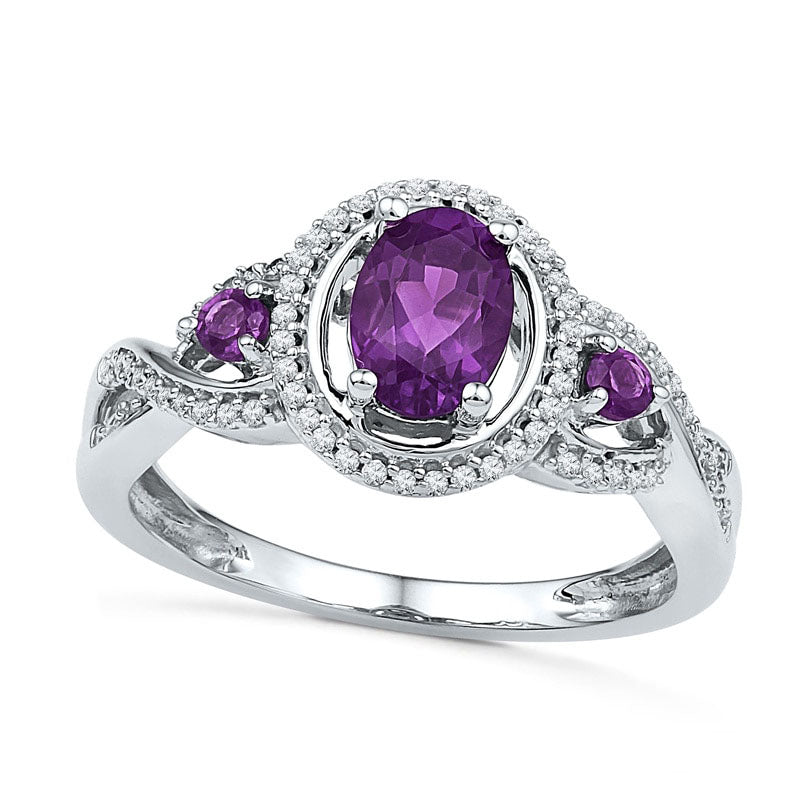 Oval Amethyst and 0.20 CT. T.W. Natural Diamond Three Stone Ring in Sterling Silver