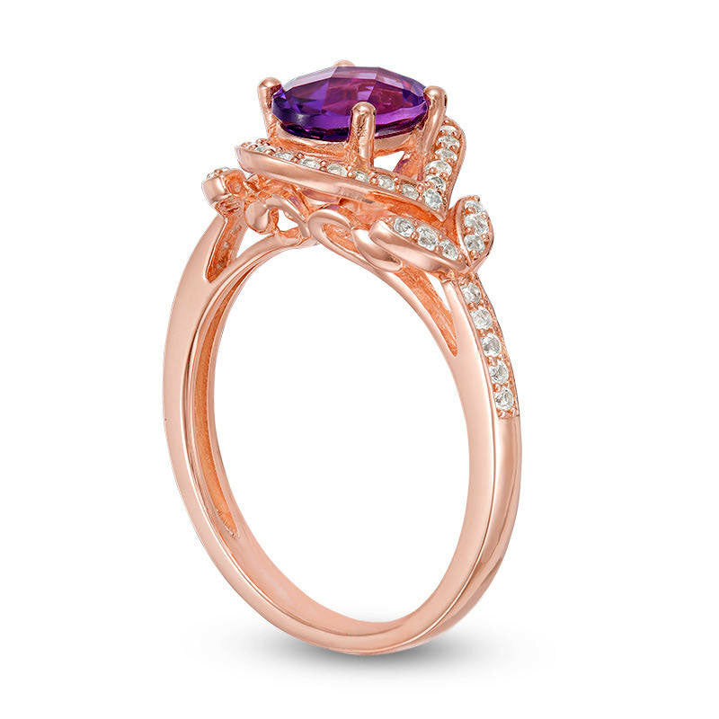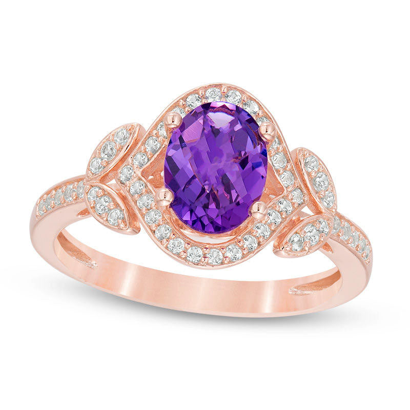 Oval Amethyst and 0.25 CT. T.W. Natural Diamond Marquise Frame Leaf-Sides Ring in Solid 10K Rose Gold