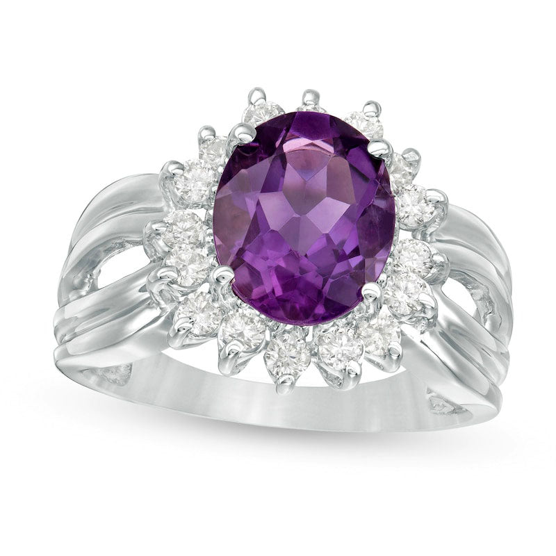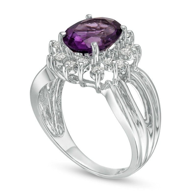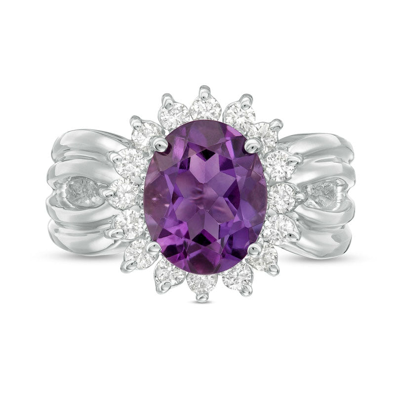 Oval Amethyst and 0.50 CT. T.W. Natural Diamond Starburst Frame Split Shank Ring in Solid 10K White Gold