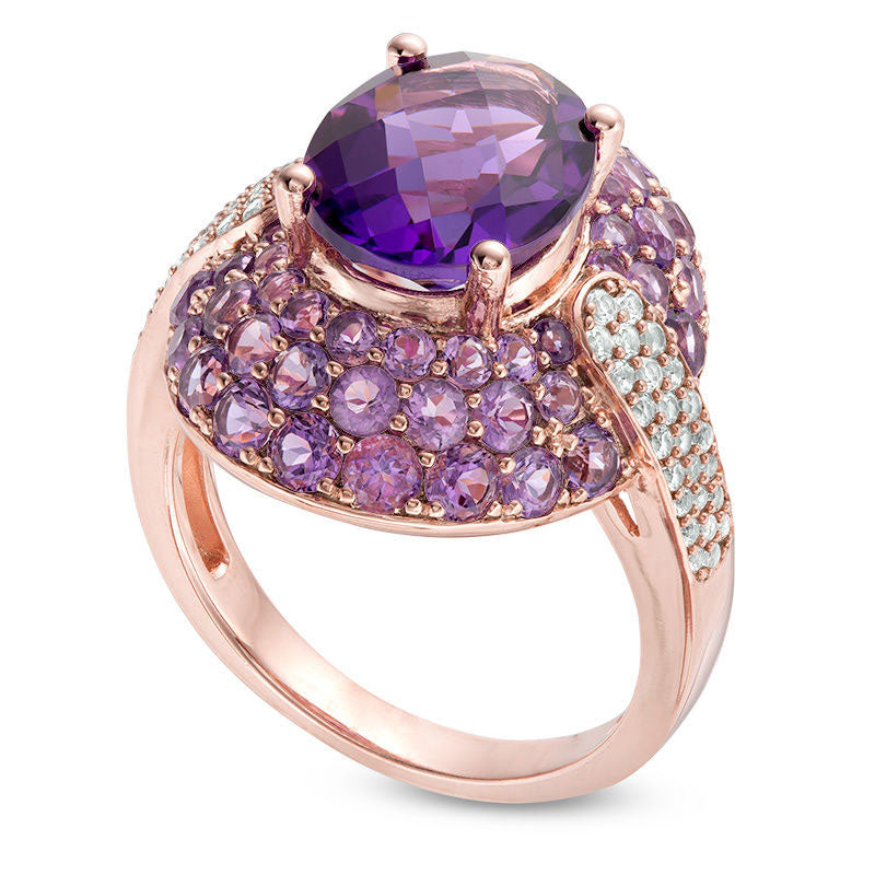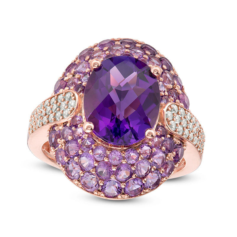 Oval Amethyst and Lab-Created White Sapphire Frame Arrow-Sides Ring in Sterling Silver with Solid 14K Rose Gold Plate