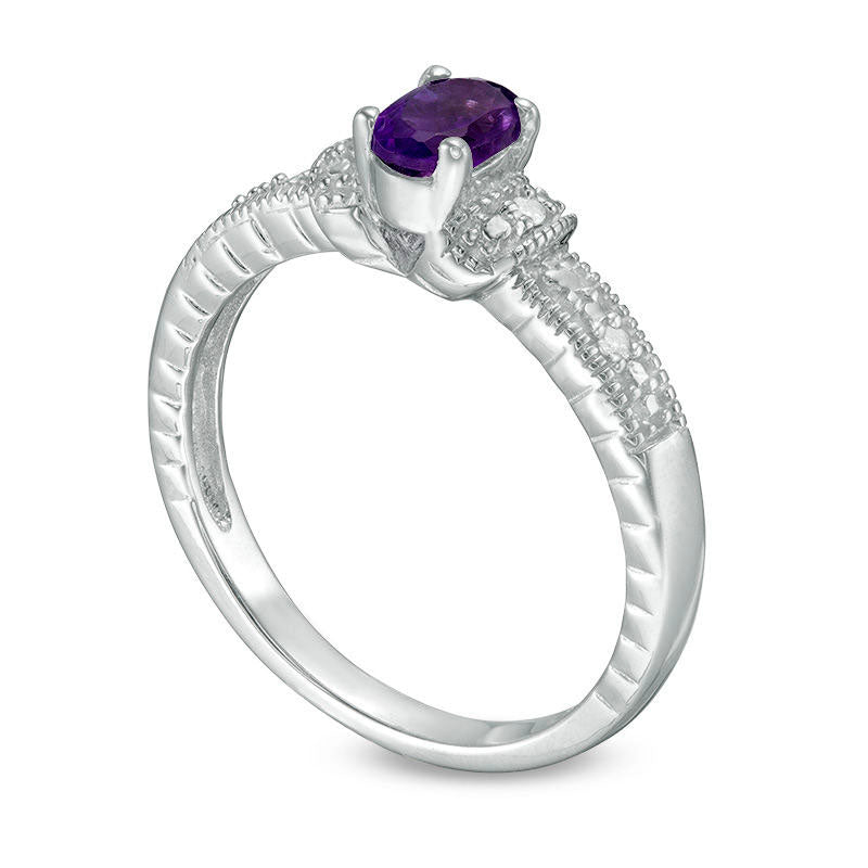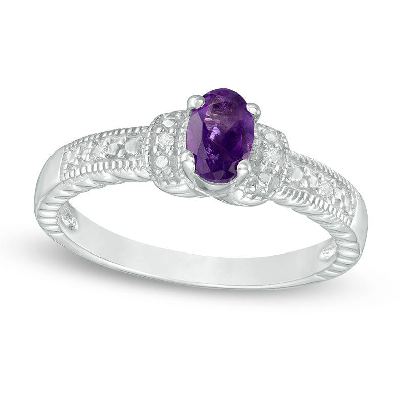 Oval Amethyst and Natural Diamond Accent Collar Antique Vintage-Style Ring in Sterling Silver