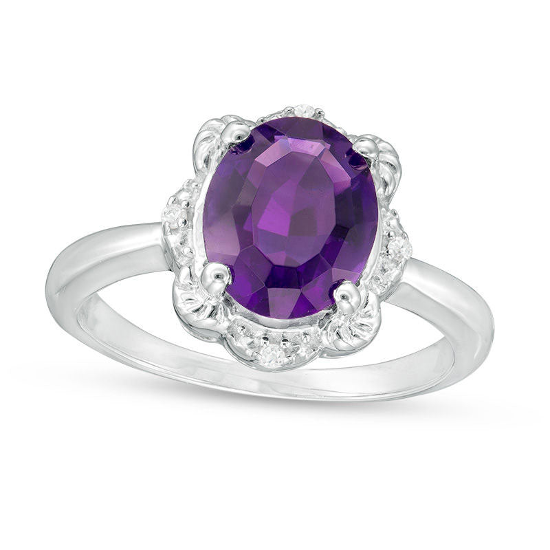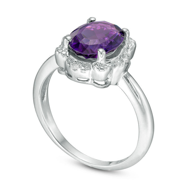 Oval Amethyst and Natural Diamond Accent Scallop Frame Ring in Sterling Silver