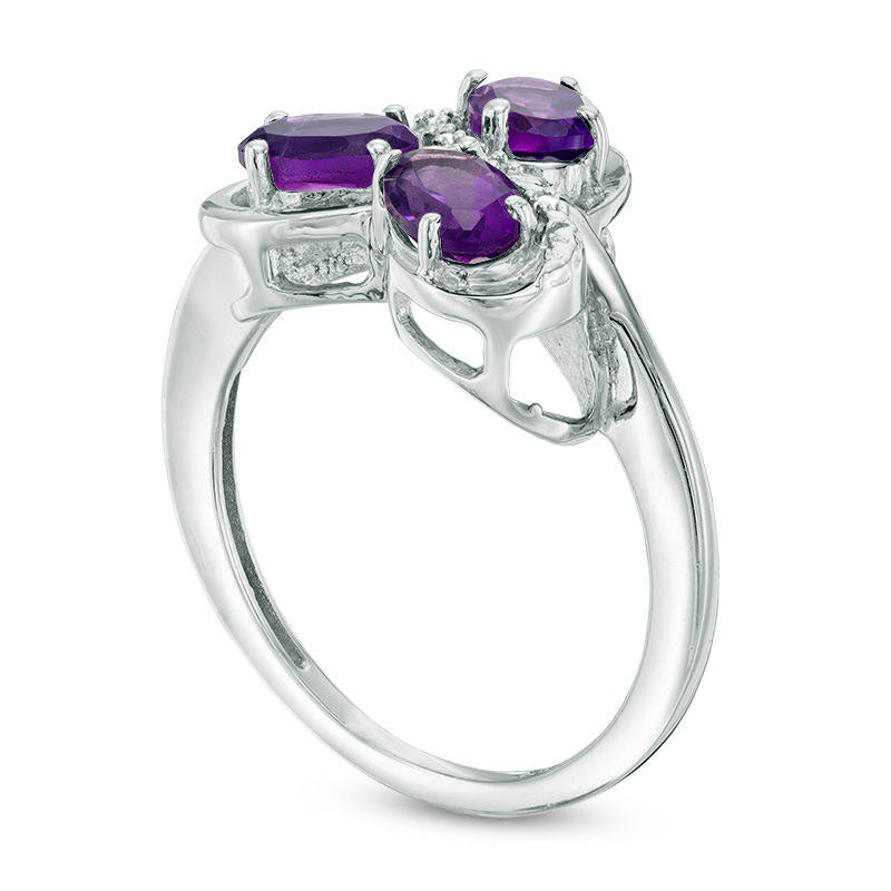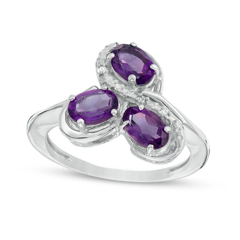 Oval Amethyst and Natural Diamond Accent Three Stone Swirl Ring in Sterling Silver