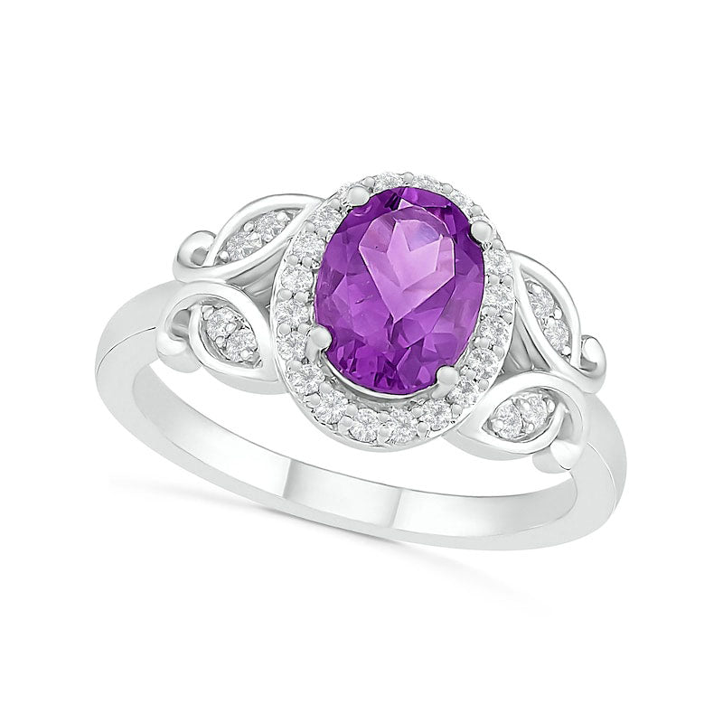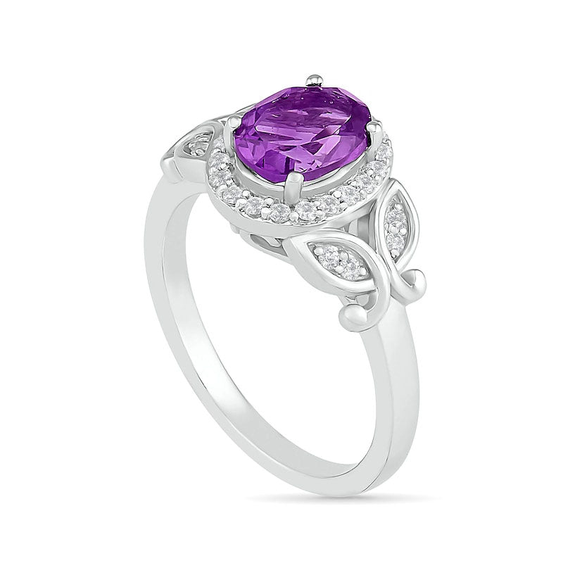 The Oval Amethyst and White Lab-Created Sapphire Frame Leaf-Sides Ring in Sterling Silver boasts a playful and lively design, perfect for adding an air of sophistication to any outfit. This...