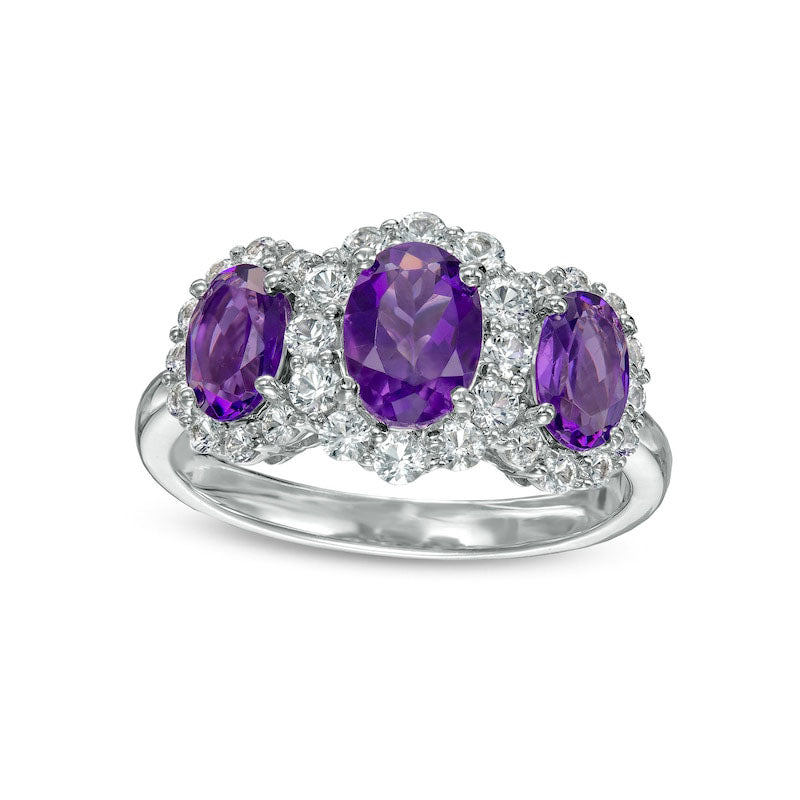 Crafted in sleek sterling silver, this stunning three stone ring boasts a captivating oval amethyst center stone measuring 7.0 x 5.0mm, flanked by two smaller oval amethyst side stones measuring 6.0 x 4.0mm. The centerpiece is framed by a brilliant display of shimmering white lab-created sapphires, adding a touch of elegance and sophistication to this exquisite piece of jewelry.