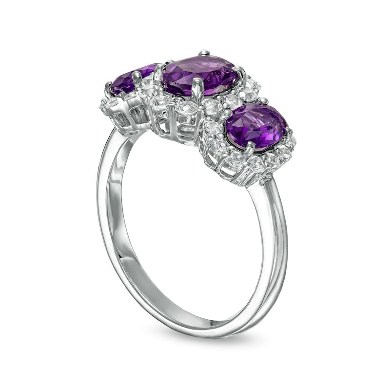 Oval Amethyst and White Lab-Created Sapphire Frame Three Stone Ring in Sterling Silver