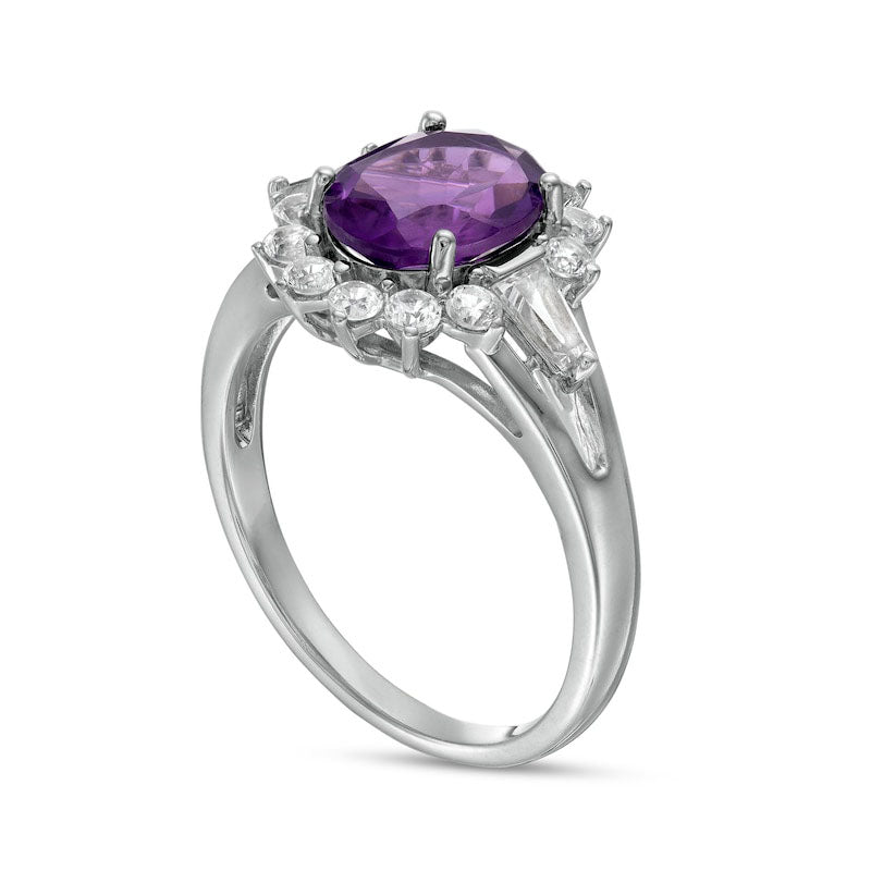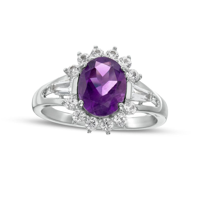 Oval Amethyst and White Lab-Created Sapphire Starburst Frame Split Shank Ring in Sterling Silver