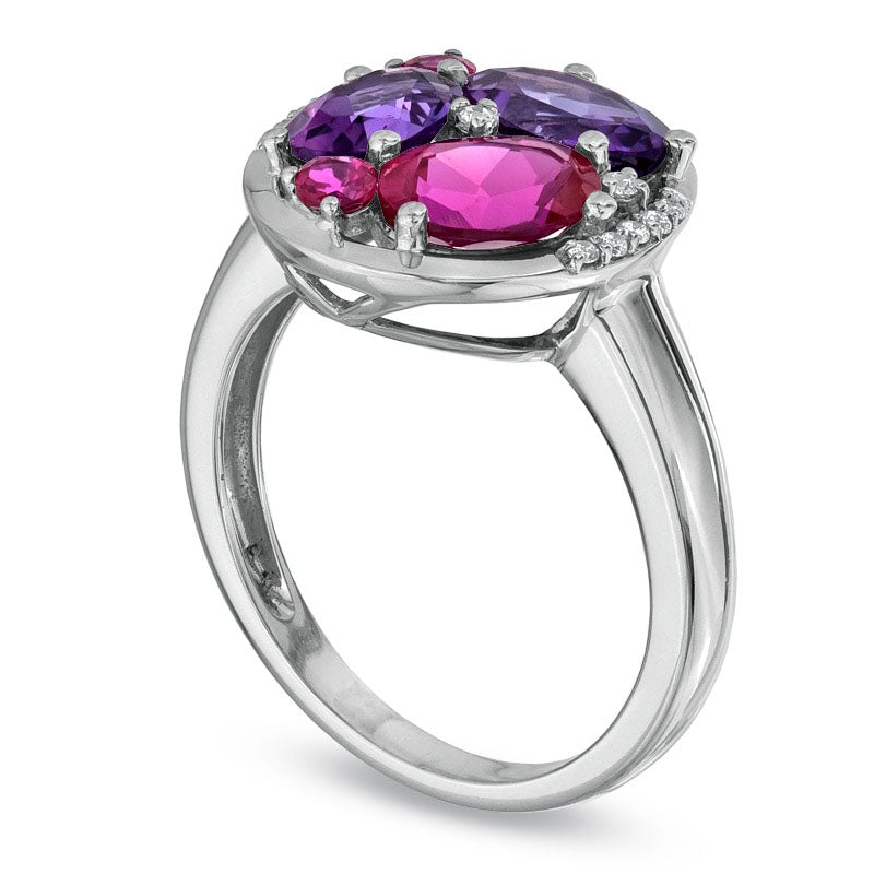 Indulge in sheer luxury with this exquisite sterling silver fashion ring embellished with oval amethysts in rich purple, oval and round lab-created rubies in deep red, and brilliantly crafted round...