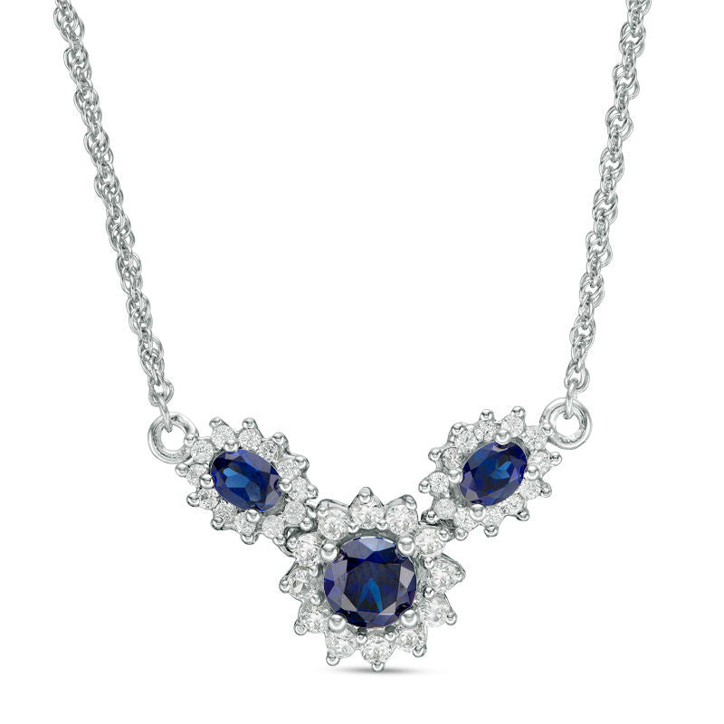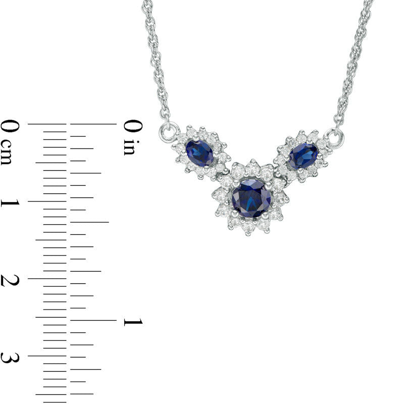 Oval and Round Lab-Created Blue and White Sapphire Sunburst Frame Three Stone Necklace in Sterling Silver