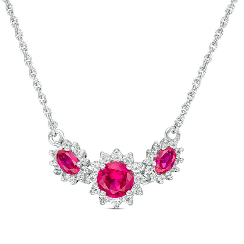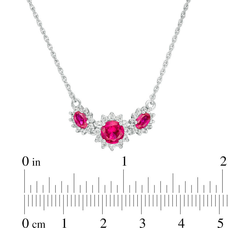 Oval and Round Lab-Created Ruby and White Sapphire Sunburst Frame Three Stone Necklace in Sterling Silver