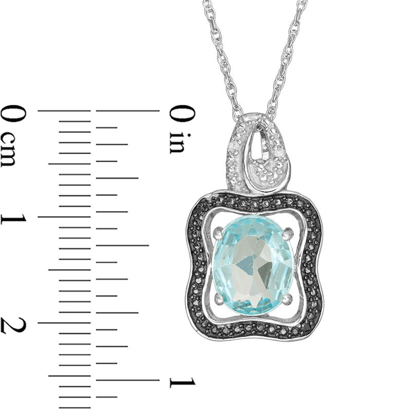Oval Blue Topaz and Enhanced Black and White Natural Diamond Accent Bead Frame Art Deco Pendant in Sterling Silver