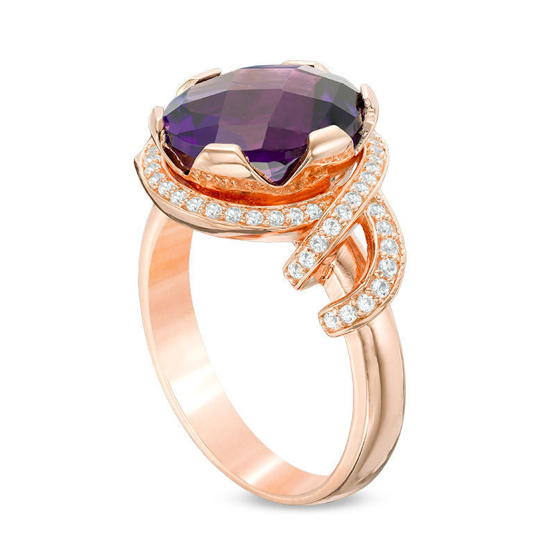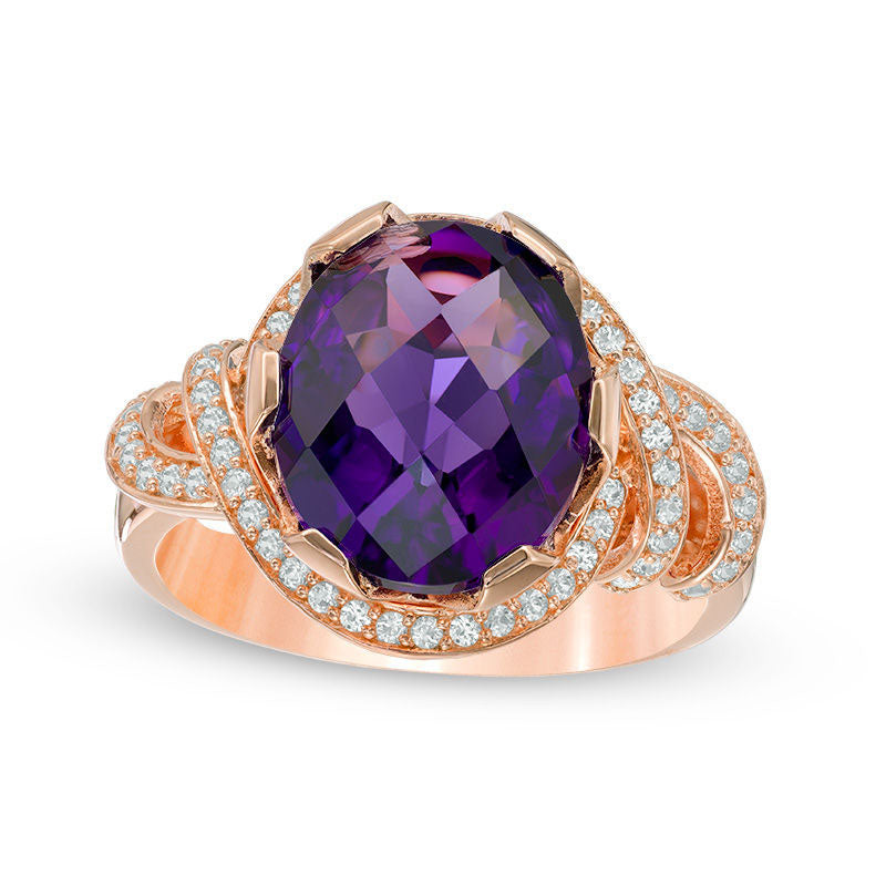 Oval Faceted Amethyst and 0.33 CT. T.W. Natural Diamond Ribbon Frame Ring in Solid 10K Rose Gold