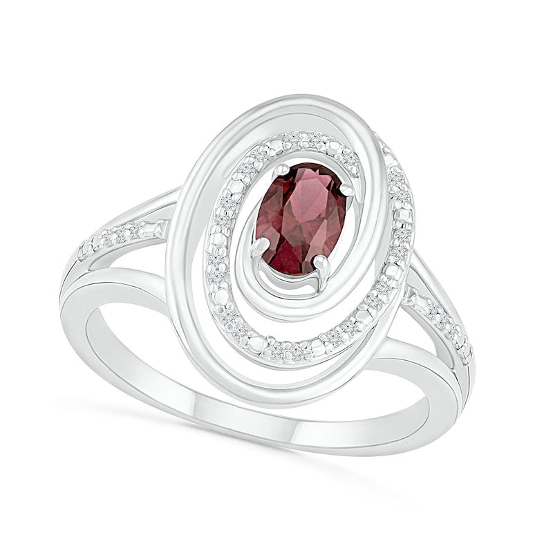 Oval Garnet and 0.07 CT. T.W. Natural Diamond Beaded Open Swirl Frame Triple Row Split Shank Ring in Sterling Silver