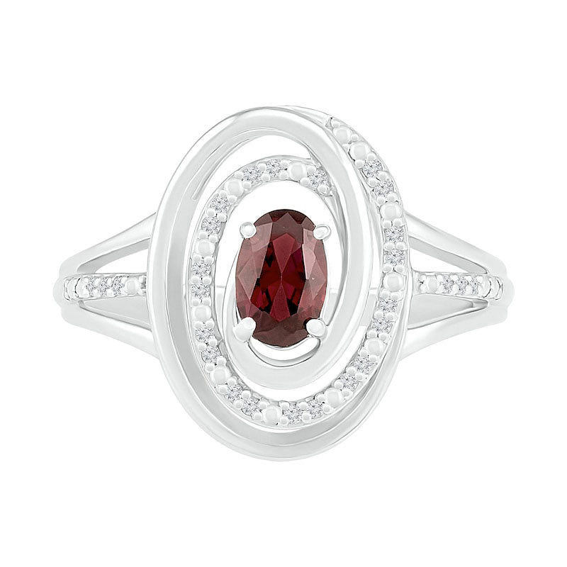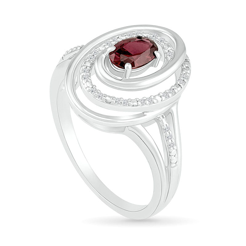 Make a statement with this stunning sterling silver ring featuring an oval-shaped 6.0 x 4.0mm red garnet surrounded by a sculpted swirl frame. The beaded ribbons and diamond-adorned triple-row split shank add texture and shine, with a total diamond weight of 1/15 ct. This unique and beautiful ring is sure to turn heads.
