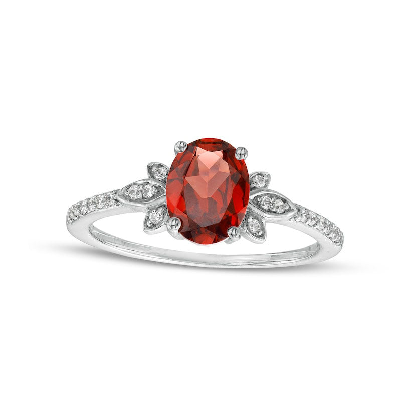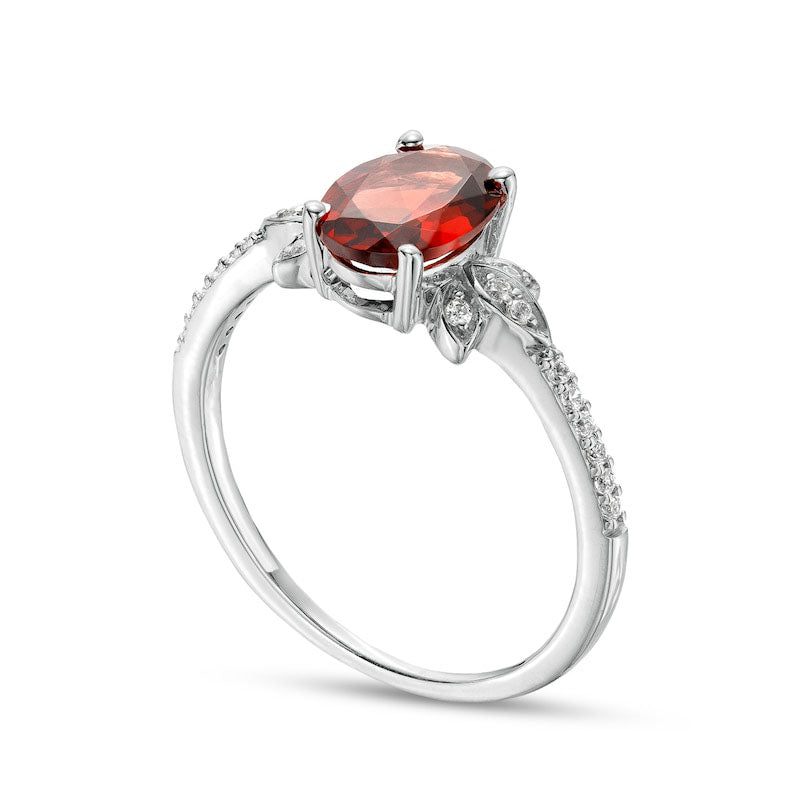 Oval Garnet and 0.10 CT. T.W. Natural Diamond Leaf-Sides Floral Ring in Solid 10K White Gold