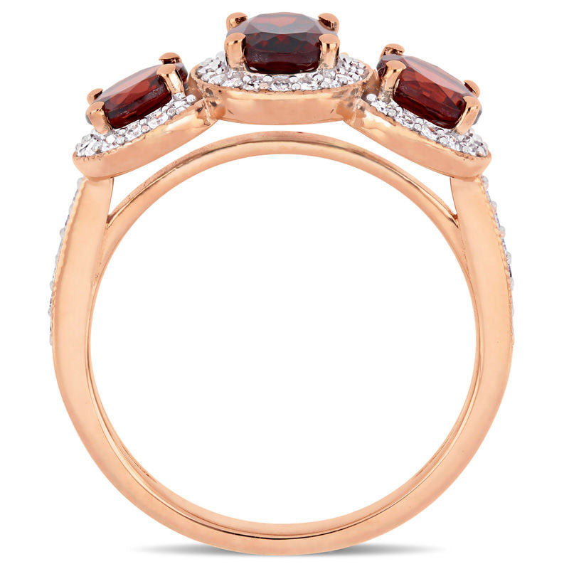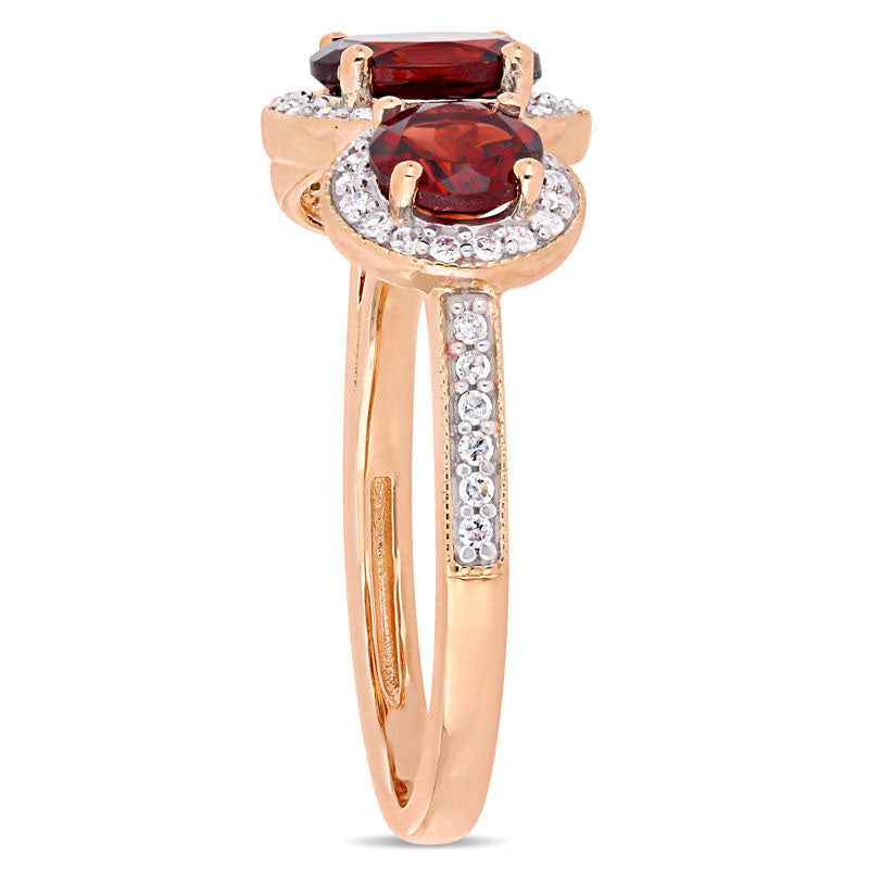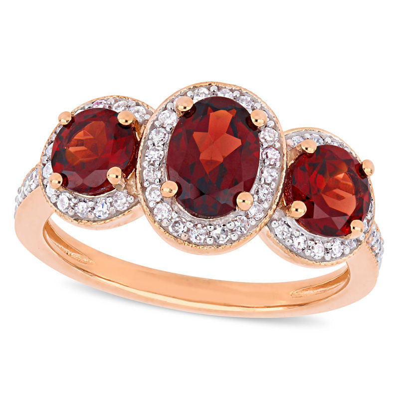 Oval Garnet and 0.25 CT. T.W. Natural Diamond Three Stone Frame Antique Vintage-Style Ring in Sterling Silver with Rose Rhodium