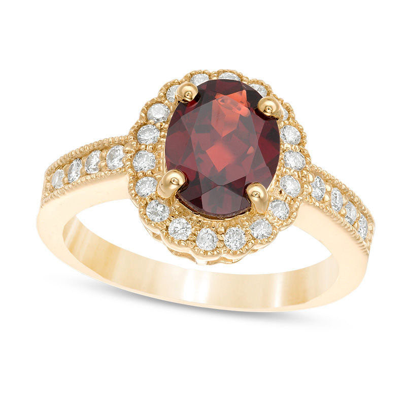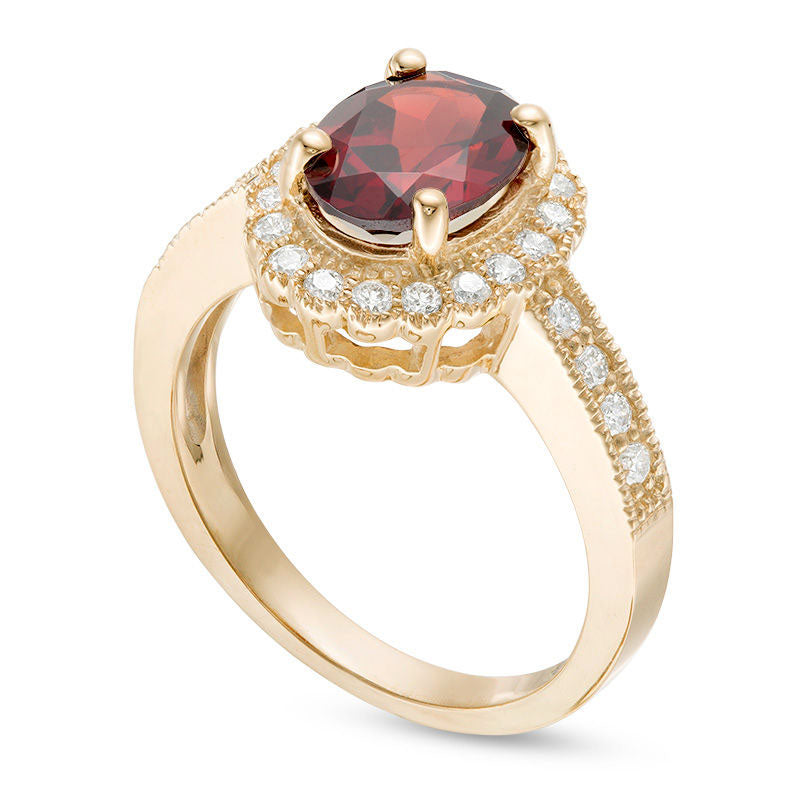 This stunning vintage-style ring is the perfect accessory to complement her feminine style. Crafted from luxurious 10K gold, it boasts a striking 9.0 x 7.0mm oval-shaped regal red garnet that is surrounded by a scalloped frame decorated with shimmering petite diamonds in intricate milgrain borders. The shank is also adorned with a row of petite diamonds and milgrain detailing. With 1/3 ct. t.w. of diamonds and a brilliant polished finish, this exquisite ring is sure to become a cherished piece in her collection.