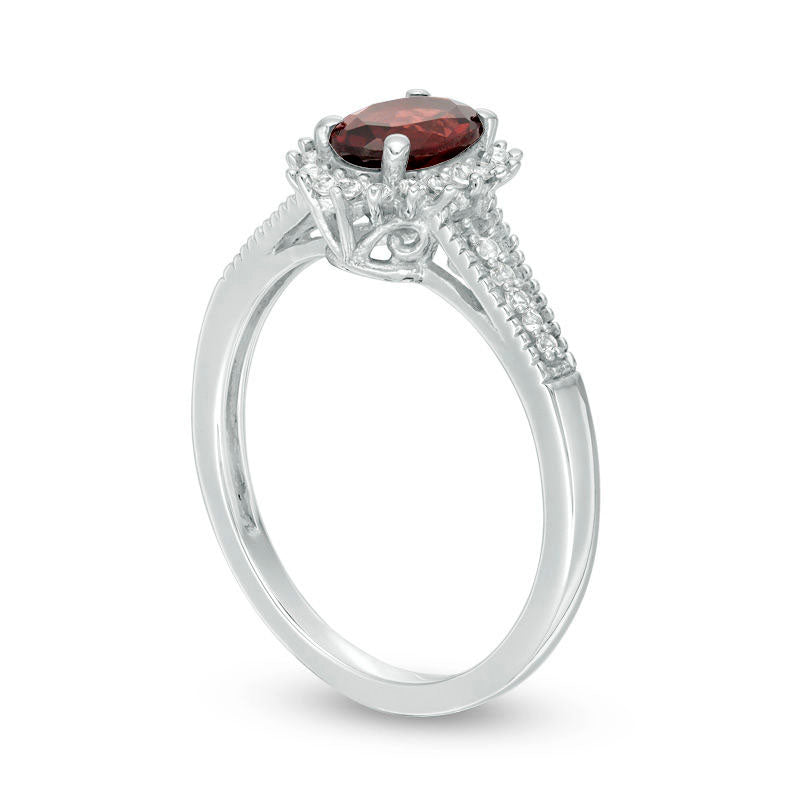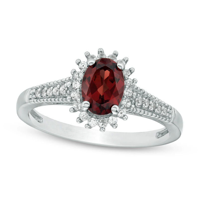 This stunning vintage-style ring is the perfect way to honor and celebrate a special someone. Crafted from high-quality sterling silver, it features a gorgeous oval-shaped red garnet at its center, nestled within a dazzling starburst frame made of shimmering lab-created white sapphires. Delicate accents of milgrain add intricate detail to the slender shank, which also sparkles with petite created white sapphires. For a truly unique touch, this ring is custom-made to fit the lucky recipient's ring size. This exquisite piece is sure to be cherished for years to come, and is buffed to a brilliant shine that will catch the eye of everyone in the room. Please note, however, that sterling silver rings cannot be resized after purchase.