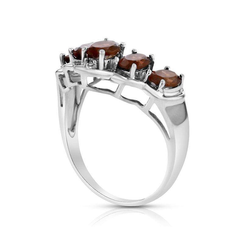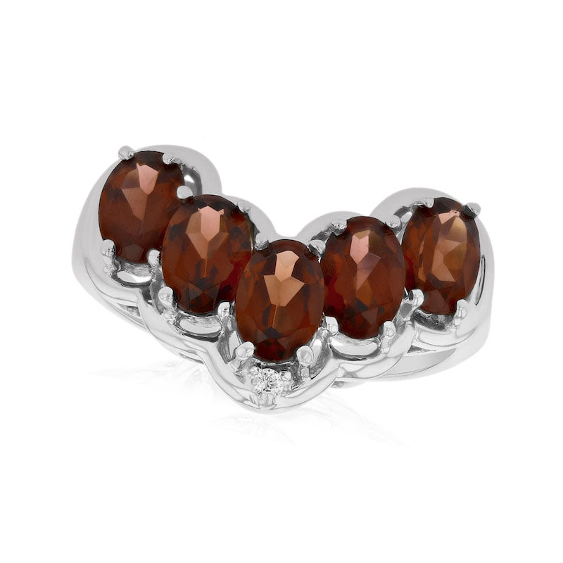 Indulge in the timeless beauty of this exquisite gemstone ring. Crafted in 14K white gold, this stunning five-stone design showcases a captivating chevron shape adorned with oval-shaped regal red garnets measuring 6.0 x 4.0mm. The centerpiece is elegantly highlighted by a single gleaming diamond accent. The ring is expertly polished to exude a brilliant luster, making it the perfect accessory to complement your contemporary style. Get ready to turn heads with this irresistible piece of jewelry.