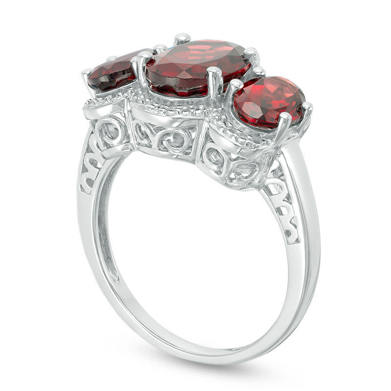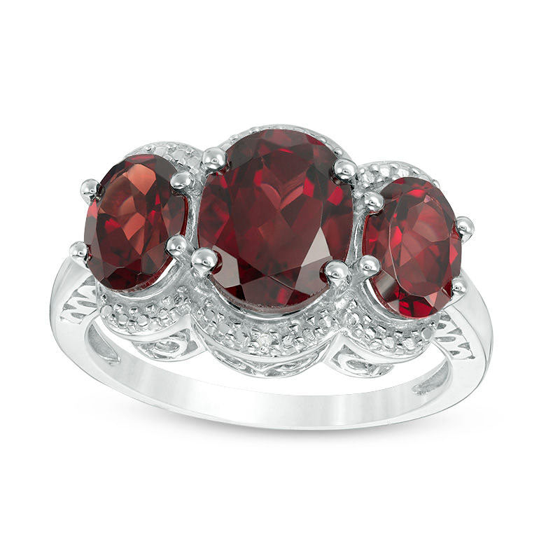Oval Garnet and Natural Diamond Accent Three Stone Frame Ring in Sterling Silver